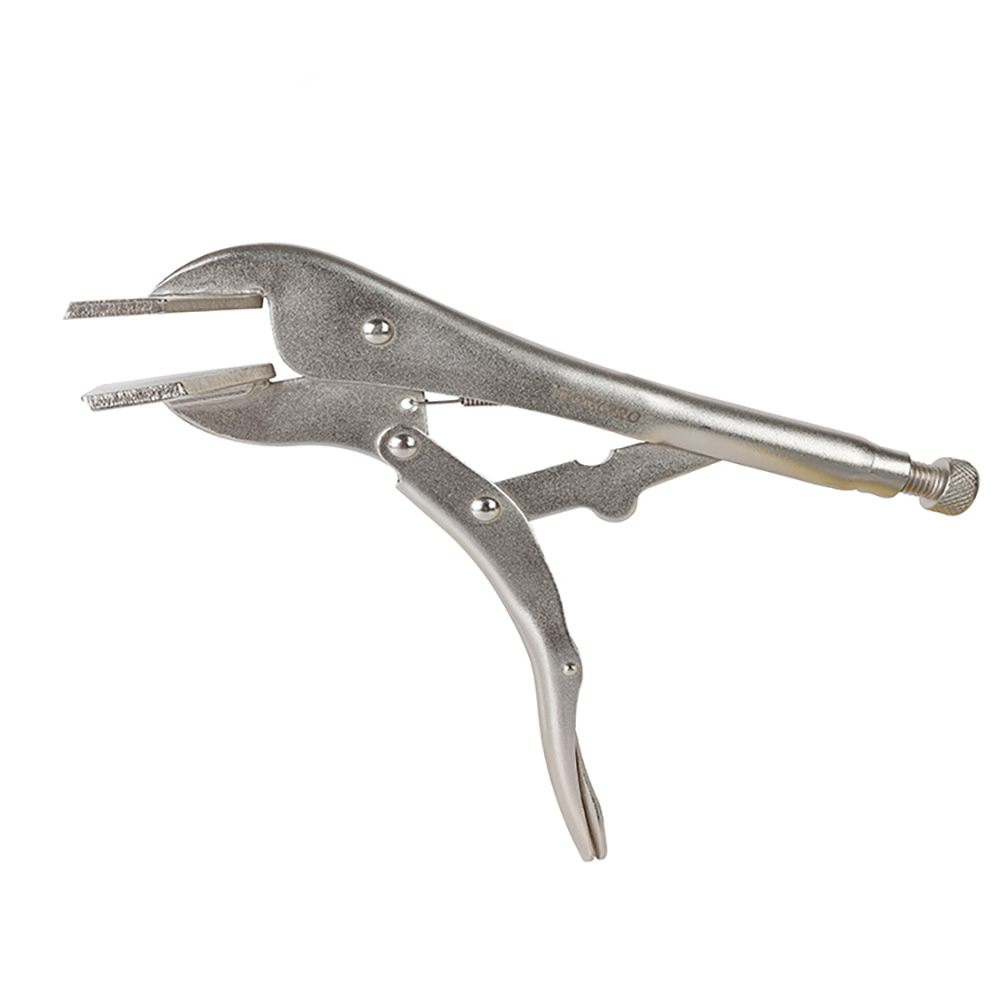 ALICATE DE PRESIÓN PARA LÁMINAS 250mm (10″). ACERO CROMO MOLIBDENO PARA MÁXIMA DURABILIDAD. ACCIÓN DE BLOQUEO Y LIBERACIÓN RÁPIDA Y SENCILLA. LA LIBERACIÓN PROTEGIDA AYUDA A MANTENER EL TRABAJO RÁPIDO Y SEGURO. GIRE EL TORNILLO PARA AJUSTAR LA PRESIÓN DE SUJECIÓN.