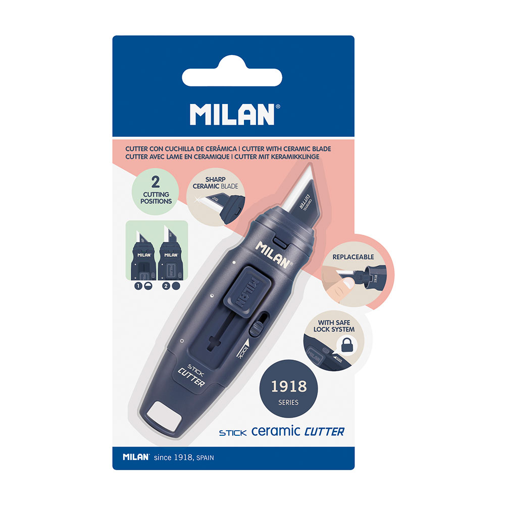 BLÍSTER CON CÚTER DE HOJA CERÁMICA STICK SERIE 1918, AZUL MARINO MILAN. CÚTER CON HOJA DE CERÁMICA REEMPLAZABLE. DISEÑO STICK, SERIE 1918 EN COLOR AZUL MARINO. CUCHILLA CON PROTECTOR Y SISTEMA DE BLOQUEO DE SEGURIDAD. BOTÓN DESLIZADOR CON DOS POSICIONES. DE PEQUEÑO TAMAÑO, TIPO ‘DE BOLSILLO’. CON SU FORMA ERGONÓMICA, ES PERFECTO PARA MANUALIDADES O PARA ABRIR PAQUETES. LA HOJA CERÁMICA CORTA DISTINTOS TIPOS DE MATERIAL. DISPONE DE UN OJAL PARA PODER SER COLGADO. HOJAS CERÁMICAS DE RECAMBIO DISPONIBLES.