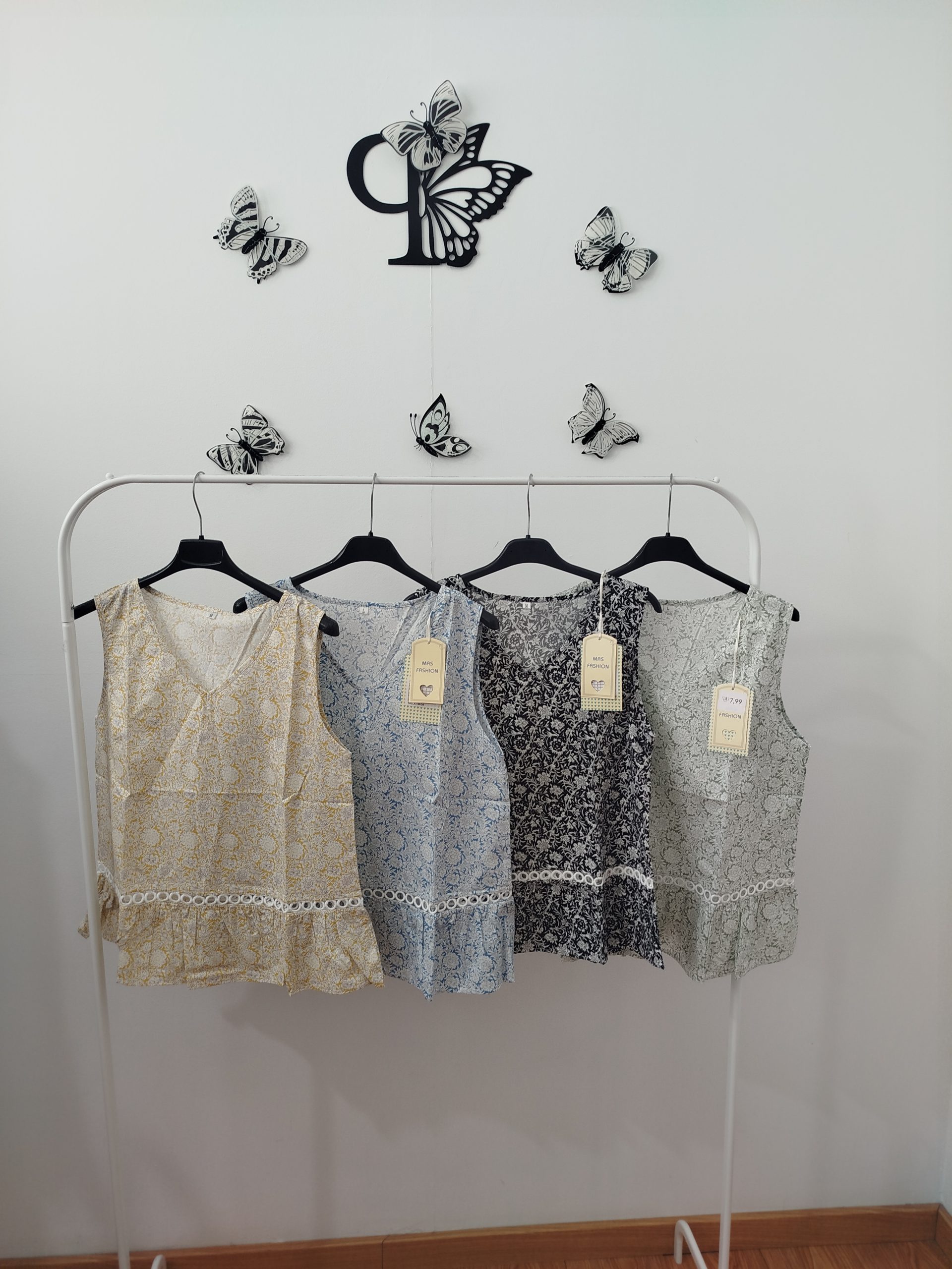 Blusa estampada con flores tela fina y decoracion de croche aciendo un cinturon en la parte de el hombrigo.
