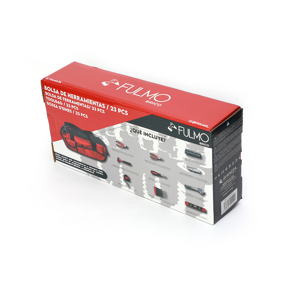 CONJUNTO DE HERRAMIENTAS DE 23 PIEZAS QUE INCLUYE: UN ALICATE DE CORTE DE 15 cm; UN ALICATE DE PUNTA DE 15 cm; UNA LLAVE INGLESA DE 15 cm; CINCO DESTORNILLADORES DE PRECISIÓN SL2.0 – SL2.5 – SL3 – PH00 – PH0; UN NIVEL DE BURBUJA DE 23 cm; UN MARTILLO DE CERRAJERO DE 300G; UN CÚTER CON HOJA DE 18 mm; UN DESTORNILLADOR DE PUNTAS; DIEZ PUNTAS DE 25 mm: SL4 – SL5 – PH1 – PH2 – PZ1 – PZ2 -T15 -T20 – H5 – H6; UNA CINTA MÈTRICA DE 5 M Y UNA BOLSA DE HERRAMIENTAS 32 X 15 X 21 cm DE TELA OXFORD 600D