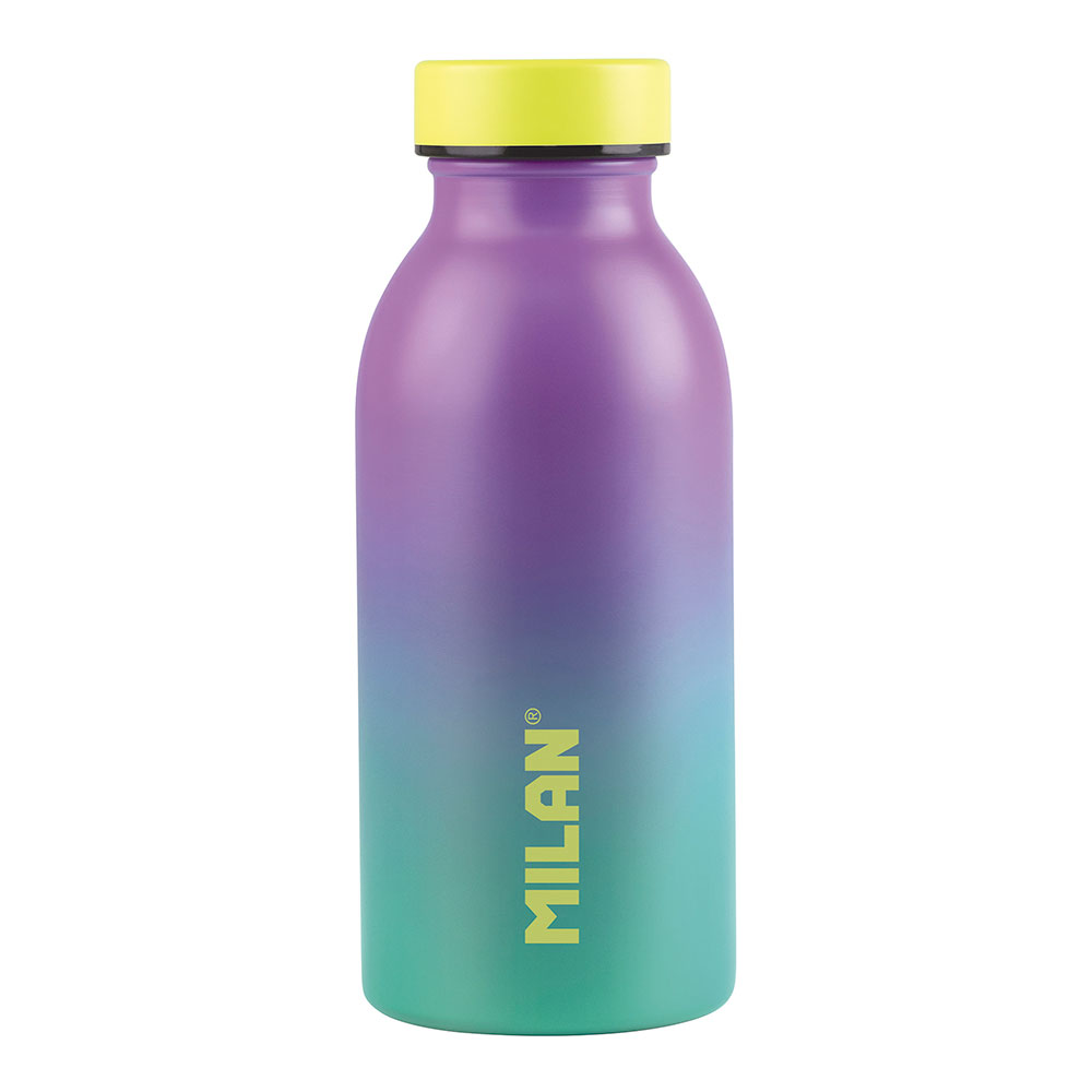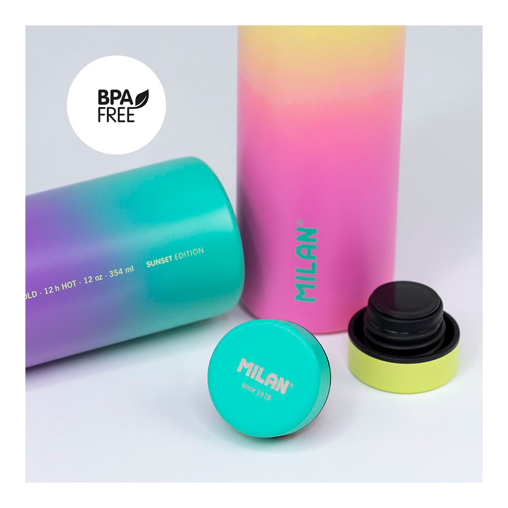 BOTELLA ISOTÉRMICA DE ACERO INOXIDABLE 304 354ml TURQUESA, EDICIÓN SUNSET MILAN.BOTELLA ISOTÉRMICA DE ACERO INOXIDABLE. EDICIÓN SUNSET, COLOR LILA-TURQUESA. CAPACIDAD: 354ml. AISLAMIENTO AL VACÍO DE DOBLE CAPA QUE ELIMINA LA CONDENSACIÓN Y PERMITE QUE LA PARTE EXTERIOR MANTENGA LA TEMPERATURA AMBIENTE. MANTIENE LA TEMPERATURA DELCONTENIDO INTERIOR (HASTA 12 H LÍQUIDOS CALIENTES Y 24 H LÍQUIDOS FRÍOS). TAPÓN DE ROSCA HERMÉTICO. WE PROTECT: EL USO DE BOTELLAS REUTILIZABLES CONTRIBUYE A REDUCIR EL CONSUMO DE BOTELLAS DE PLÁSTICO DE UN SOLO USO.