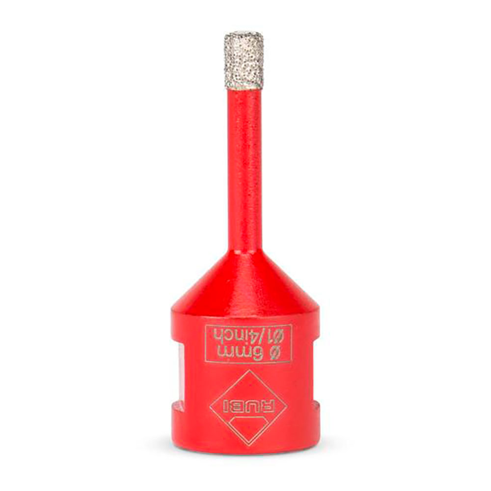 BROCA DRYGRES Ø6mm. 5988 RUBI. RECOMENDABLE PARA LA PERFORACIÓN DE TODO TIPO DE BALDOSA CERÁMICA, EN ESPECIAL LAS DE GRES PORCELÁNICO, Y OTROS MATERIALES DE REVESTIMIENTO COMO EL MÁRMOL Y EL GRANITO. REALIZAR UN PEQUEÑO MOVIMIENTO ORBITAL CONSTANTEMENTE MIENTRAS SE PERFORA Y PERFORAR SOLO LA CERÁMICA Y CONTINUAR PERFORANDO EL SOPORTE CON UNA BROCA NORMAL PARA ESE USO. SON PERFECTAS PARA LA COLOCACIÓN DE ACCESORIOS DE BAÑO O CUALQUIER TIPO DE ACCESORIO DE DECORACIÓN SOBRE SUPERFICIES CERÁMICAS. SON DE CORTE SECO Y PUEDEN SER UTILIZADAS, GRACIAS A SU CONEXIÓN CON ROSCA M14, DIRECTAMENTE CON UNA AMOLADORA.