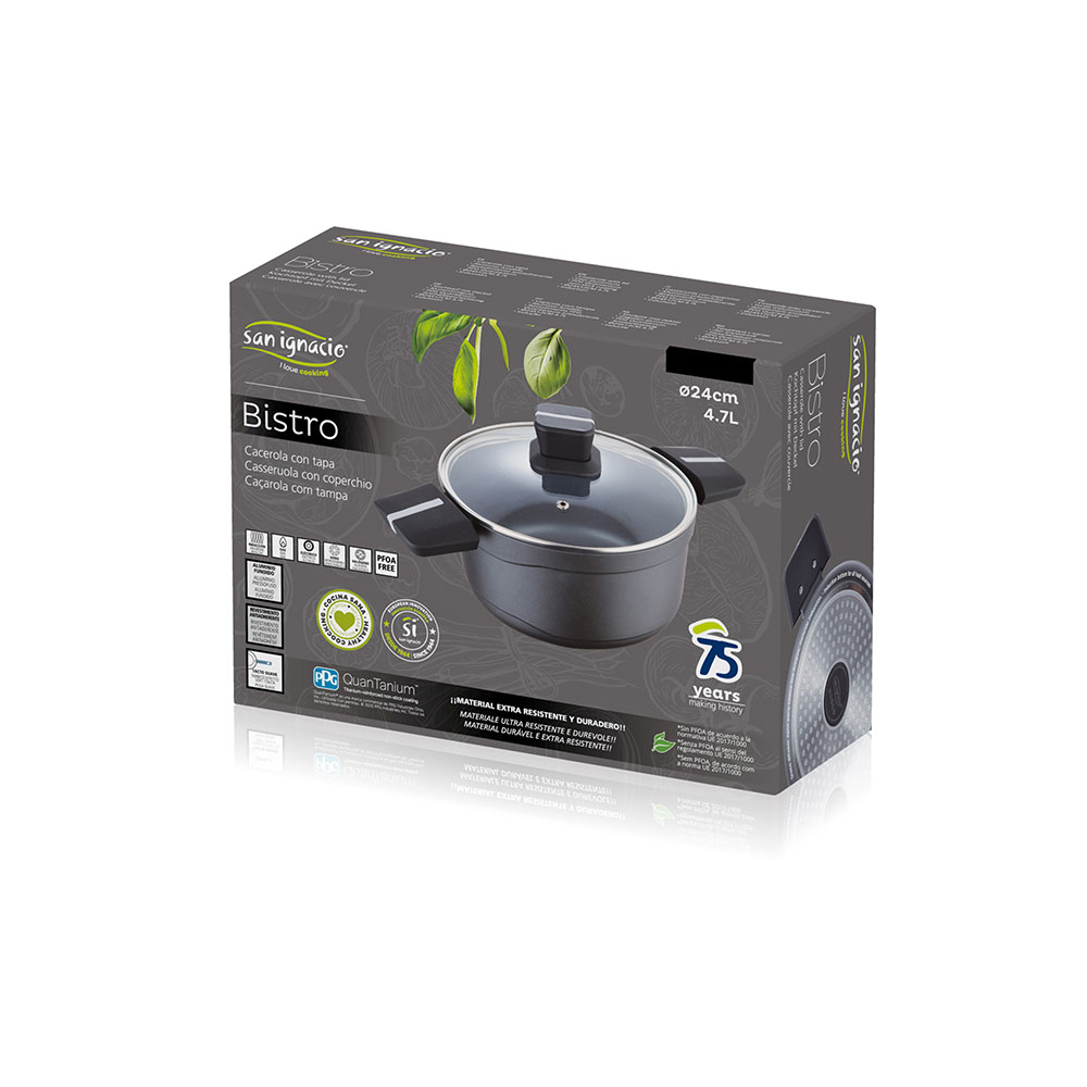 CACEROLA Ø24x12cm ALUMINIO FUNDIDO 1,7mm DE GROSOR IND CON TAPA BISTRO GREY SG6426 SAN IGNACIO. CACEROLA CON TAPA INTERIOR EN ALUMINIO FUNDIDO REVESTIMIENTO EXTERIOR EN ACERO QUANTANIAN WOOL EN NEGRO MATE. DOT INDUCCIÓN NEGRO ASA SOFT TOUCH CON INSERTO DE SILICONA GRIS