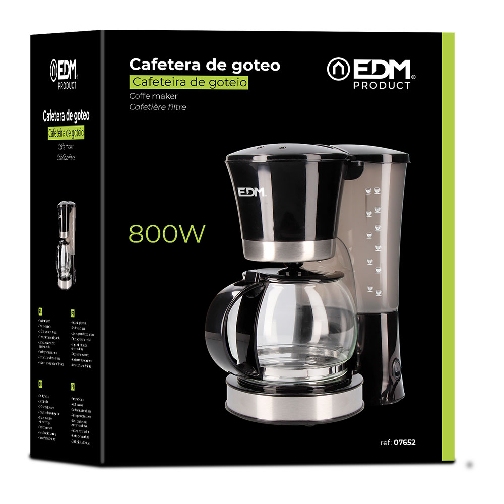 CAFETERA DE GOTEO 12 TAZAS 1,2L – POTENCIA: 800W. FUNCION ANTI-GOTEO. FILTRO BASCULANTE DE NYLON DESMONTABLE Y LAVABLE. INDICADOR LUMINOSO ON/OFF. DEPOSITO DE AGUA TRASLUCIDO CON MARCAS DE NIVEL. FUNCION DE TERMORETENCION. MANTIENE EL CAFE CALIENTE DURANTE 30 min. PROTECCION DE SOBRECALENTAMIENTO. DIMENSIONES: 16,5 x 22 x 29 cm (ancho/fondo/alto) 220-240V 50Hz EDM