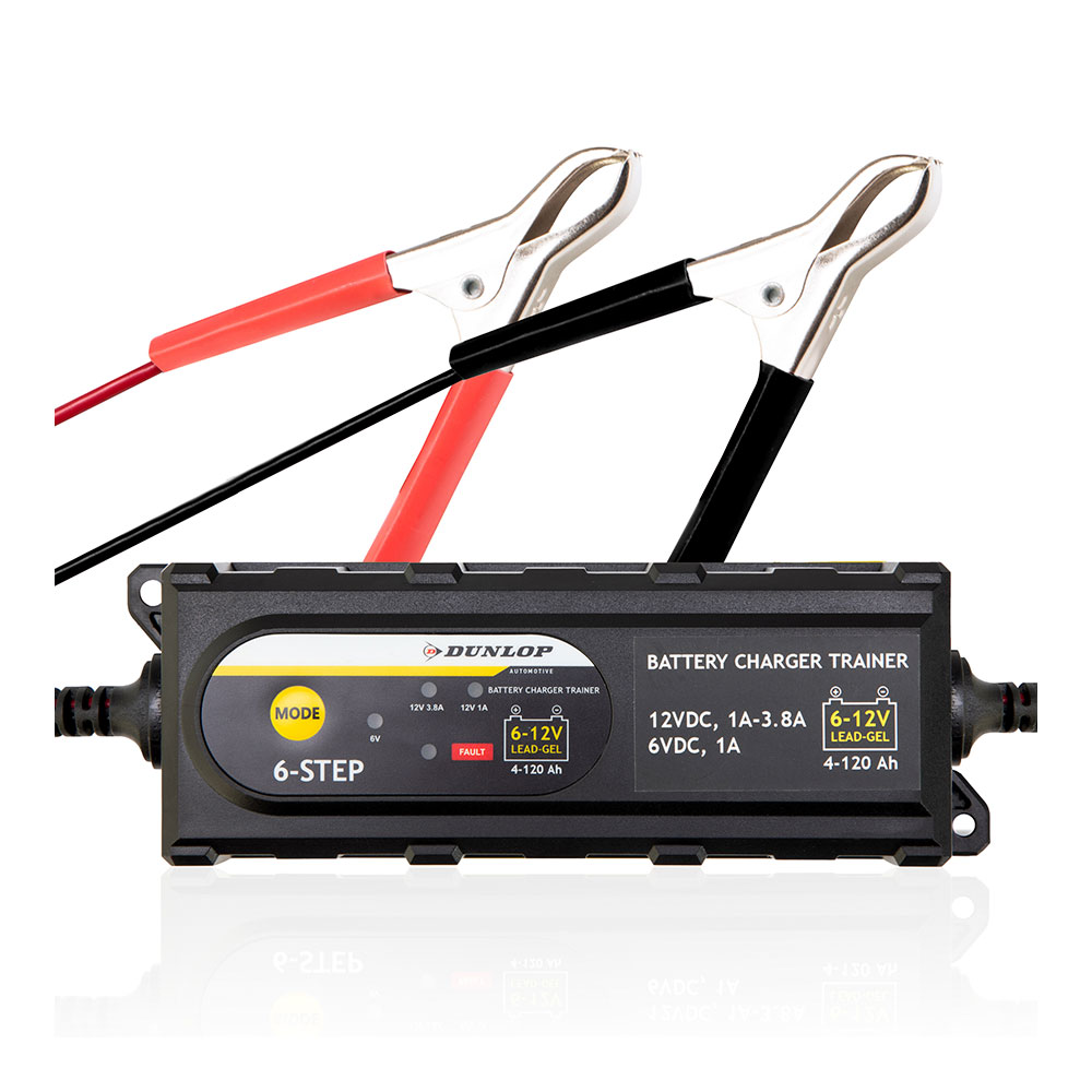 CARGADOR PARA BATERÍA DE COCHE 6/12V DUNLOP. CARGA INTELIGENTE DE 6 ETAPAS PARA BATERÍAS DE PLOMO Y GEL DE 6/12V. PROTECCIÓN CONRA CHISPAS, CORTOCIRCUITOS, SOBRECALENTAMIENTO E INVERSIÓN DE POLARIDAD. 4 – 120Ah.