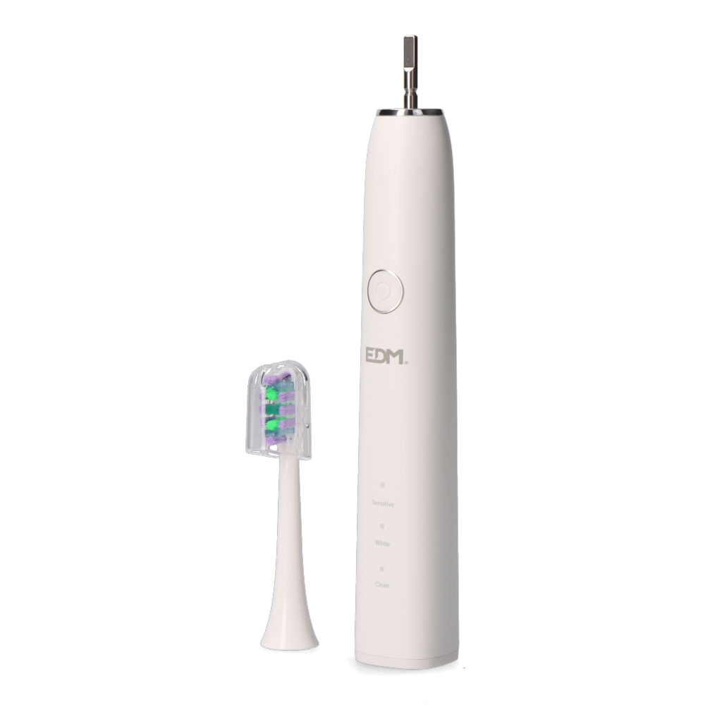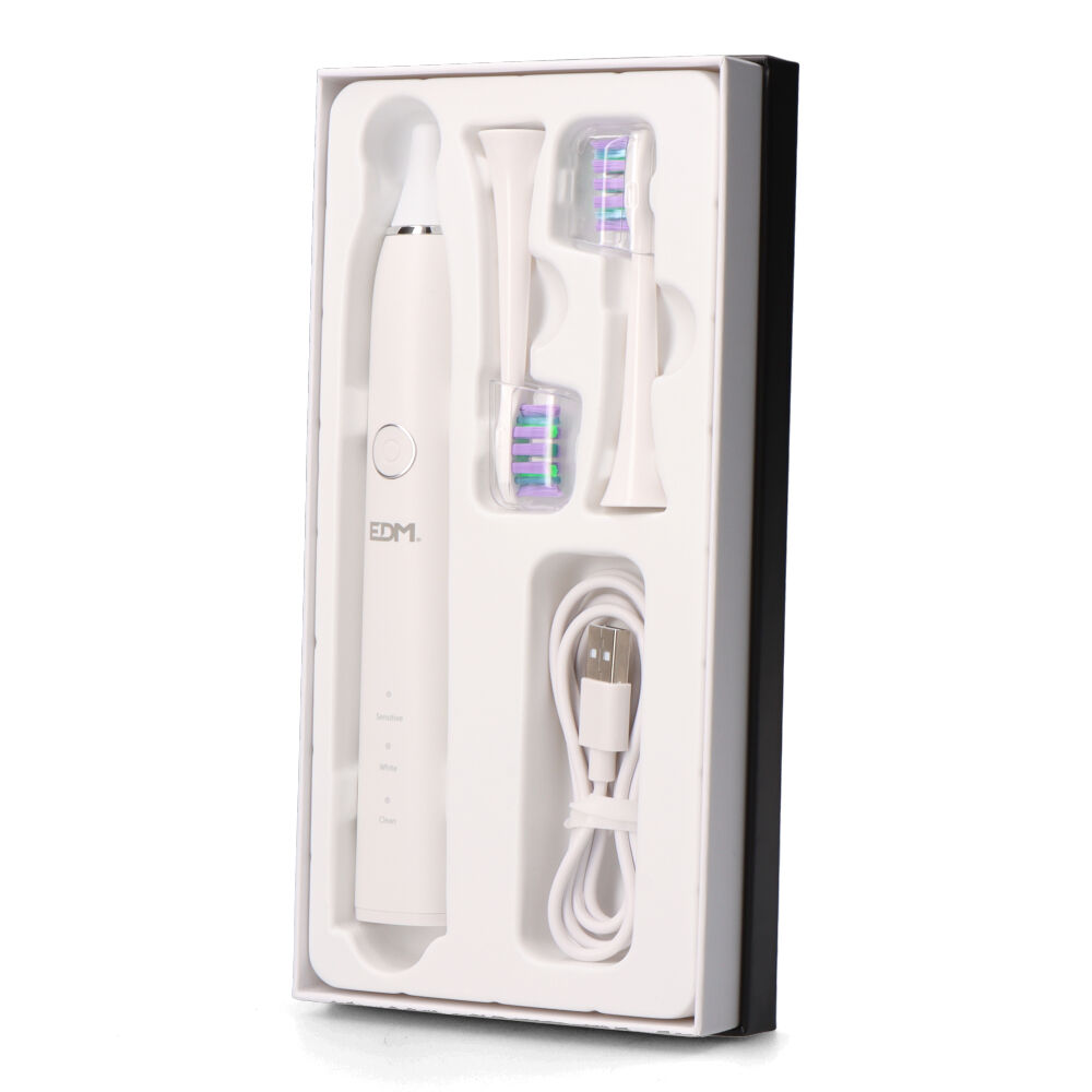 CEPILLO DE DIENTES ELÉCTRICO EDM. 3 MODOS DE VIBRACIÓN CON INDICADOR. RESISTENCIA AL AGUA IPX7. BATERÍA RECARGABLE CON CONECTOR TIPO C. TIEMPO DE CARGA: 3 HORAS. DURACIÓN APROXIMADA: 45 DÍAS. DIMENSIONES: 2,8×2,8×24,8cm. INCLUYE: CUERPO DEL CEPILLO, 2 CABEZALES, 1 CABLE USB-C