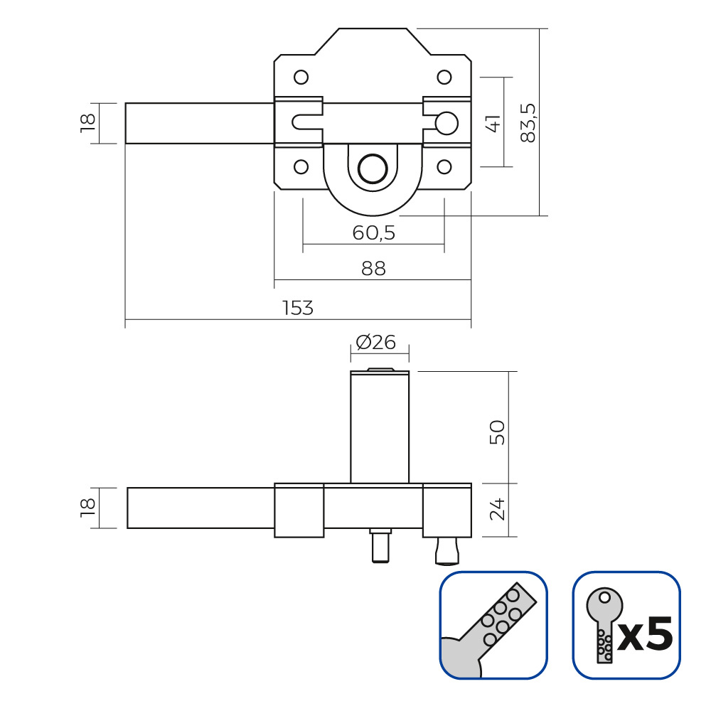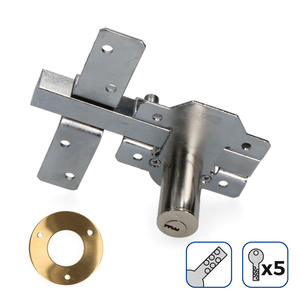 CERROJO DE SUPERFÍCIE DE COLOR NÍQUEL CON CILINDRO REDONDO DE SEGURIDAD Y PESTILLO APERTURA. INCLUYE 5 LLAVES DE SEGURIDAD.