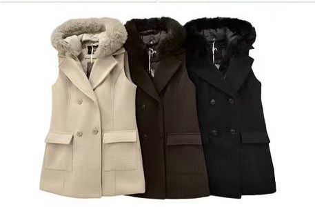 Chaleco muy abrigado y elegante con cuatro botones,bolsillos y pelo en el cuello.