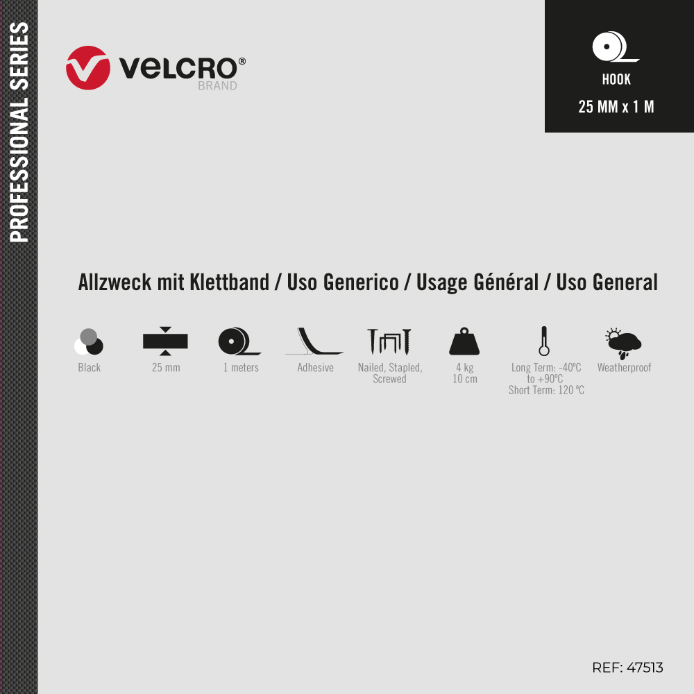 CINTA ALFA-LOK, ANCHO 25mm, LONGITUD 1m, LINEAL DE GANCHO, COLOR NEGRO