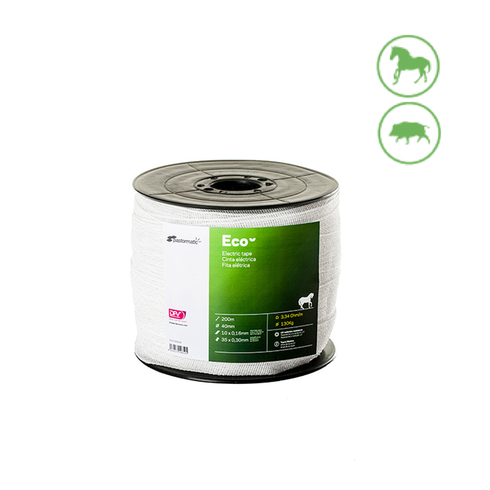CINTA CONDUCTORA 40mm PASTORMATIC. 10 CORDS CONDUCTORES: (0, 16mm ACERO INOX.) 34 CORDS: (0,30mm) . LONGITUD 200m. RESISTENCIA ELÉCTRICA (Ohm) 3,34. CARGA ROTURA: 130kg.