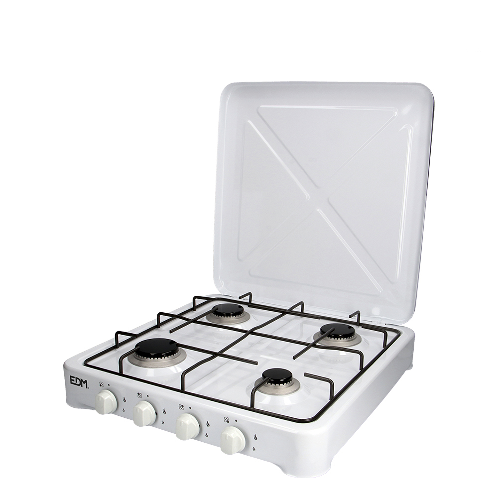 COCINA DE GAS ESMALTADA 4 FUEGOS. 2 FUEGOS Ø65mm + 1 FUEGO Ø75mm + 1 FUEGO DE Ø50mm. COLOR BLANCO. PARA UTILIZAR CON GAS BUTANO Y SOLO EN EXTERIORES. DIMENSIONES: 57x52x7,5cm EDM