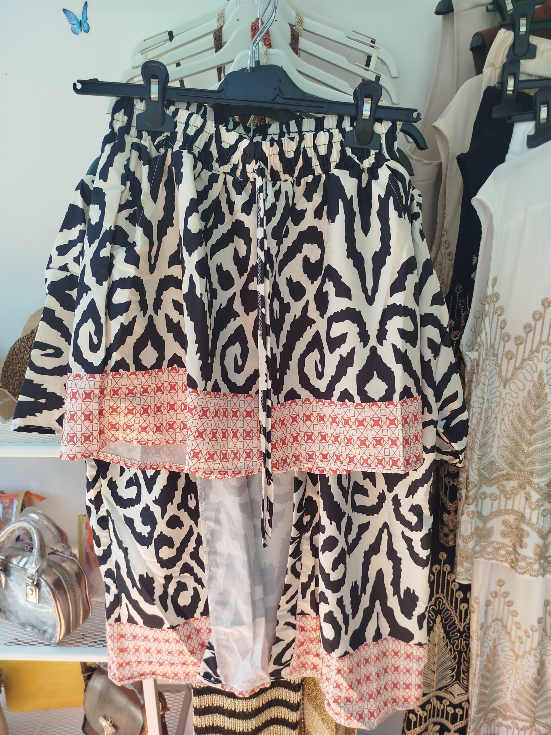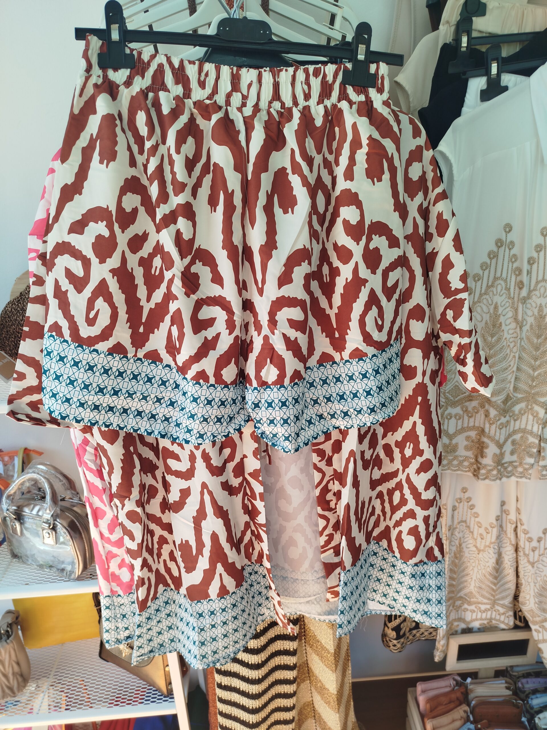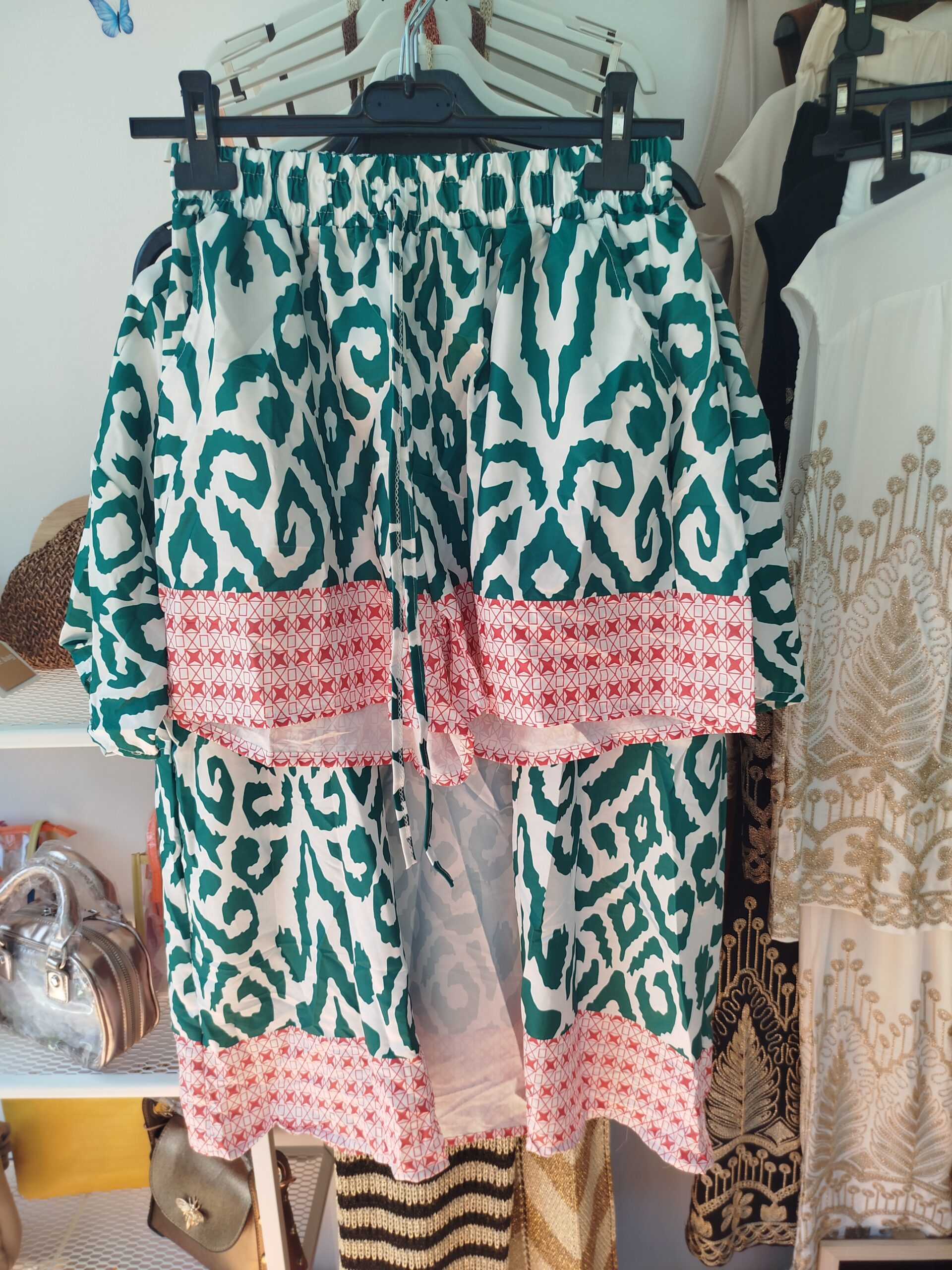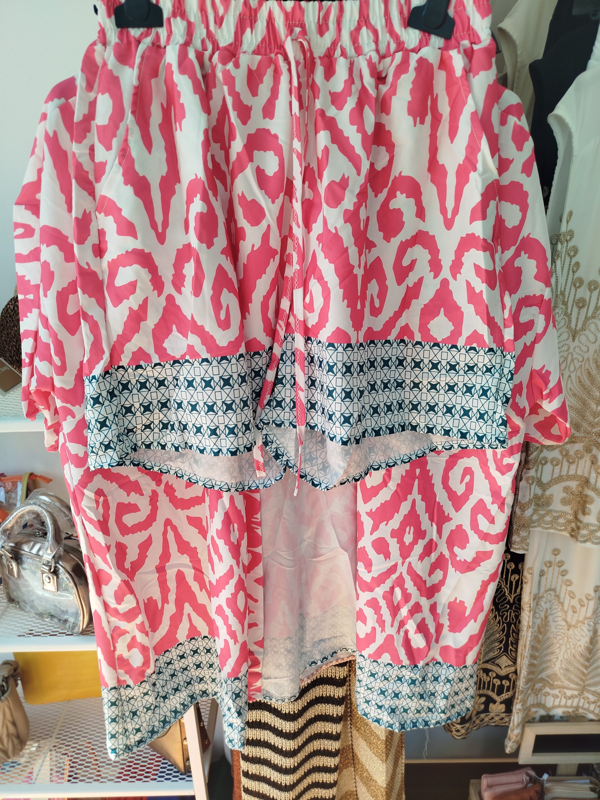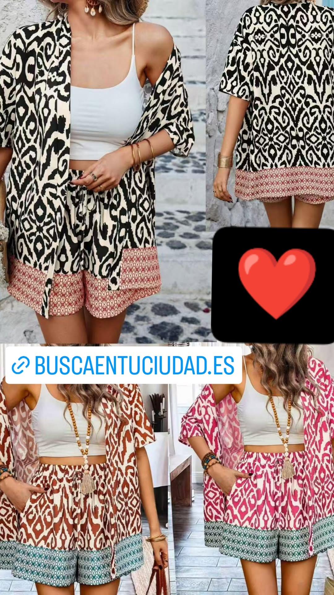 Conjunto Caribe, fantástico conjunto de dos piezas pantalón corto con cintura elástica y chaqueta abierta sin botones .