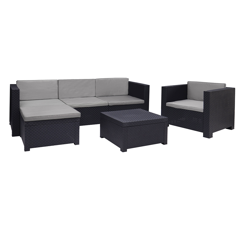 SET MANHATTAN GRAFITO SP BERNER. SET CHAISE LONGUE CON TEXTURA DE RATAN PLANO FORMADO POR UN BANCO DE TRES PLAZAS, SILLON INDIVIDUAL, POUF Y MESA. FABRICADO EN ESPAÑA CON MATERIALES RECICLADOS. MEDIDAS SILLÓN 72x66x74cm (alto/profundo/largo) SOFÁ: 72x66x190cm (alto/profundo/largo) MESA: 34x57x57cm (alto/profundo/largo) POUF: 39x56x56cm (alto/profundo/largo) RESISTENTE UV, RESTITENTE A LA LLUVIA, FACIL DE LIMPIAR. FABRICADO TOTALMENTE EN RESINA. COJINES DE COLOR GRIS INCLUIDOS.