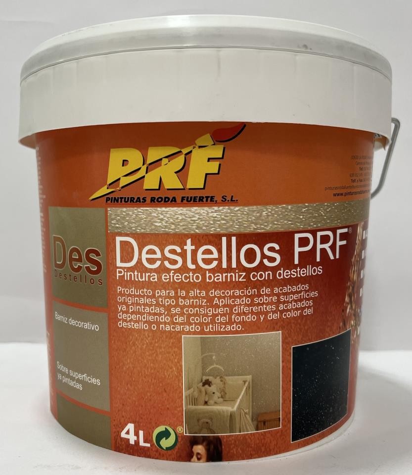 Producto para la alta decoración de acabados originales de tipo barniz. Aplicados sobre superficies ya pintadas, se consigue los diferentes acabados dependiendo del color del fondo y por supuesto del color del destello o nacarado utilizado.