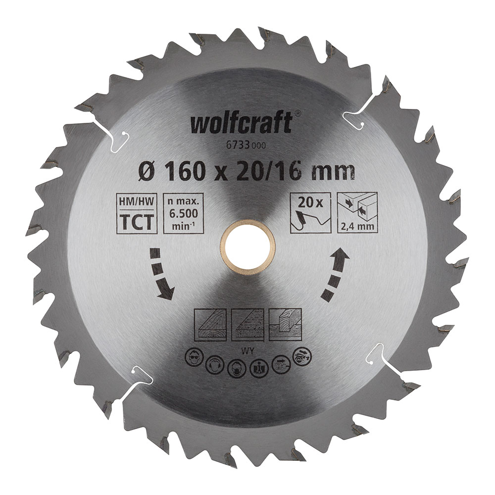 DISCO DE SIERRA CIRCULAR DE MANO CV, SERIE MARRÓN; CORTES RÁPIDOS Y BASTOS; DIÁMETRO DE TRABAJO: Ø160mm; ALOJAMIENTO DEL AGUJERO: 20mm; ANCHO DE CORTE: 2.4mm; NÚMERO DE FILOS: 20; VELOCIDAD MÁX. DE ROTACIÓN: 7.000 RPM; DISCO DE SIERRA CT CON DENTADO ALTERNADO Y BAJO NÚMERO DE DIENTES; PARA CORTES LONGITUDINALES Y TRANSVERSALES RÁPIDOS Y BASTOS EN MADERA Y TABLERO DE VIRUTAS; LARGA DURACIÓN; DIMENSIONES: Ø160mm; PESO: 0,275kg 6733000 WOLFCRAFT