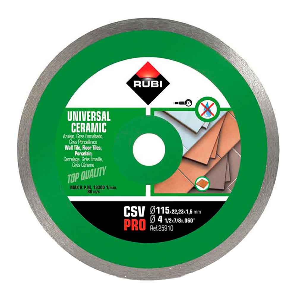 DISCO DIAMANTADO CSV Ø115mm PRO. SON LA MEJOR OPCIÓN PARA EL CORTE, EN SECO Y CON AMOLADORA, DE TODO TIPO DE BALDOSA CERÁMICA. SE ADAPTAN, MEJOR QUE NINGÚN OTRO DISCO, A AQUELLAS SITUACIONES EN LAS QUE EL COLOCADOR PROFESIONAL DE BALDOSA CERÁMICA TIENE QUE TRABAJAR CON BALDOSAS CERÁMICAS DE DISTINTAS NATURALEZAS. REDUCE LOS TIEMPOS MUERTOS GENERADOS POR LA NECESIDAD DE CAMBIAR DE DISCO CADA VEZ QUE CAMBIAMOS DE MATERIAL.