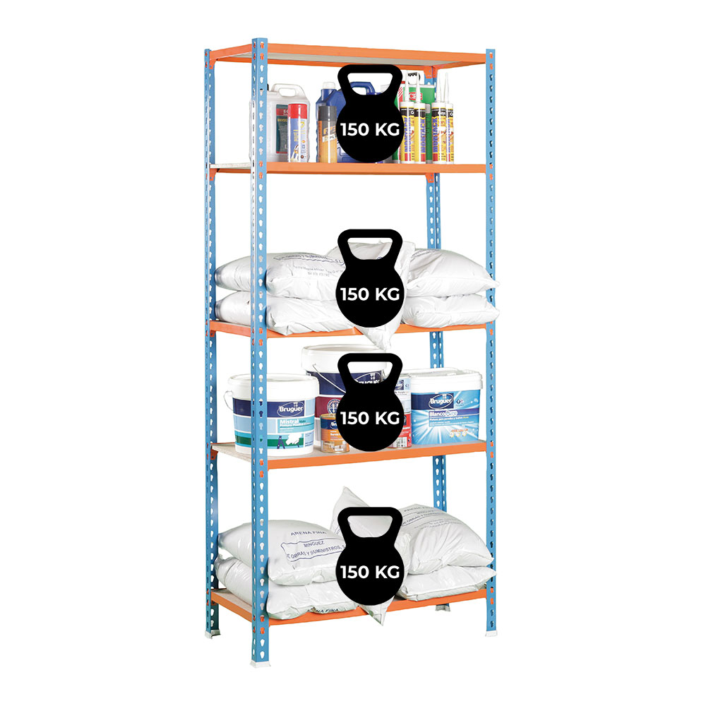 ESTANTERÍA METÁLICA SIN TORNILLOS DE COLOR AZUL/NARANJA/MADERA CON CAPACIDAD DE CARGA POR ESTANTE DE 150 kg. EL NÚMERO DE ESTANTES ES 5 Y LAS MEDIDAS (ALTO X ANCHO X FONDO) SON 1800x900x400 mm. TIENE ESTANTES DE AGLOMERADO DE 12 mm. PRODUCTO ESPAÑOL DE CALIDAD EUROPEA, MEDIDAS EN USO DEL PRODUCTO: 1787x877x410 mm
