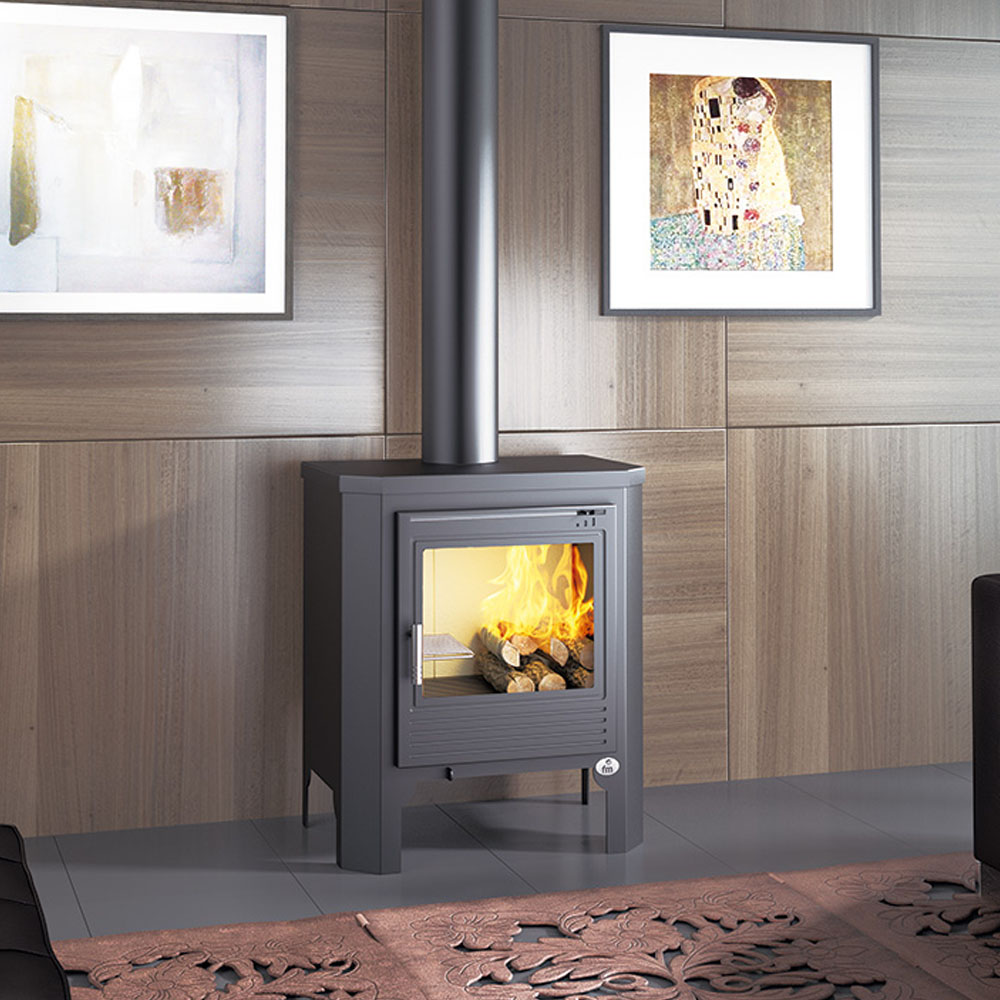 ESTUFA DE LEÑA FRONTAL FM. ELABORADO EN ACERO DE HASTA 4mm. CAJÓN CENICERO EXTRAÍBLE. INTERIOR EN VERMICULITA. PUERTA Y PARRILLA DE FUNDICIÓN. SISTEMA DE DOBLE COMBUSTIÓN. SALIDA ECODESIGN, TUBO DE SALIDA: Ø150 mm (MACHO). 11-15KW, IDEAL PARA 305m³ 59kg, 57x40x71,7cm