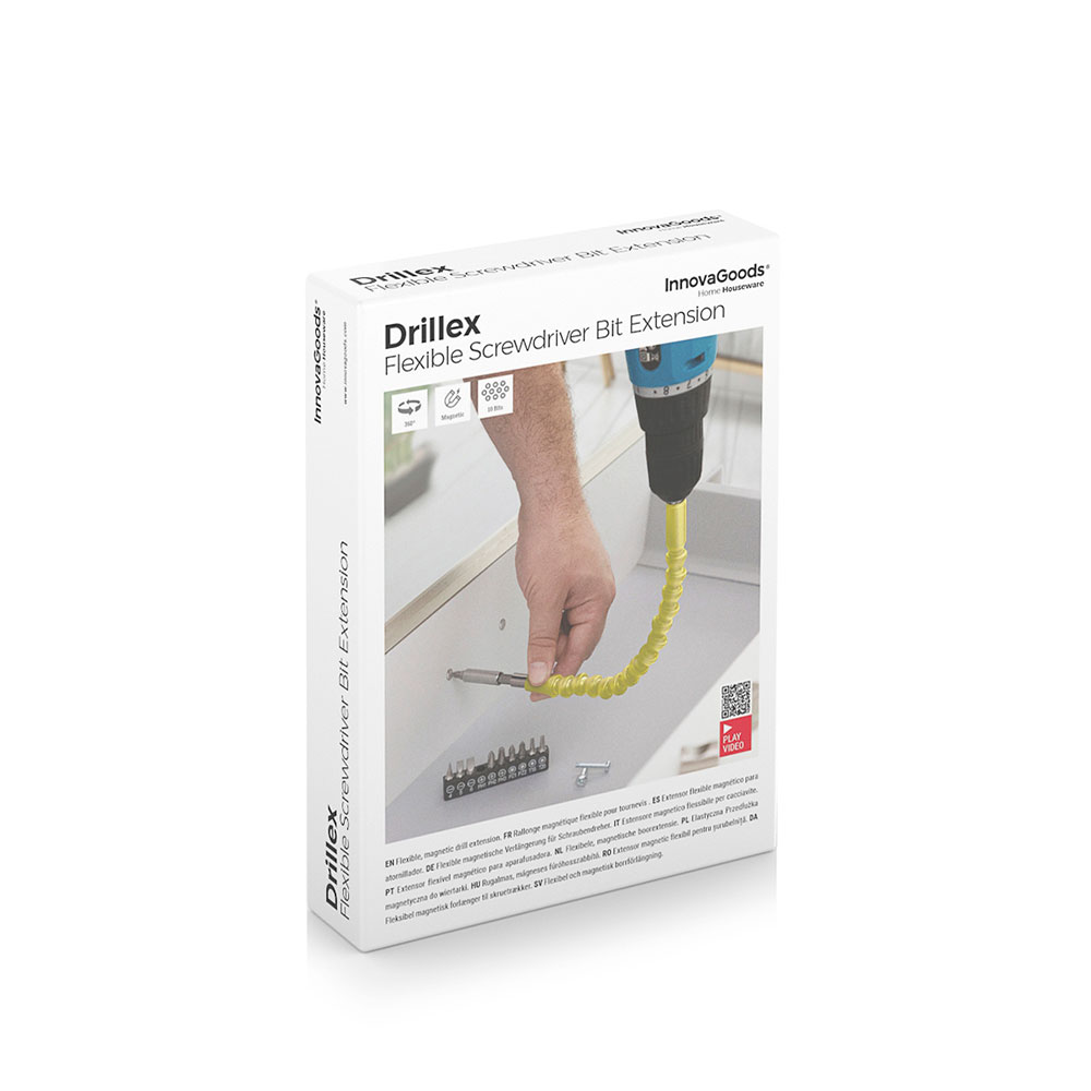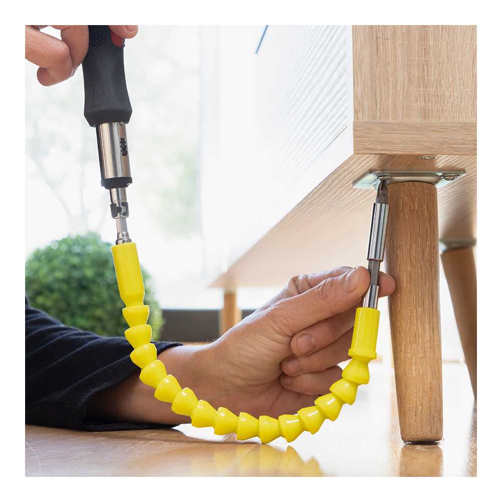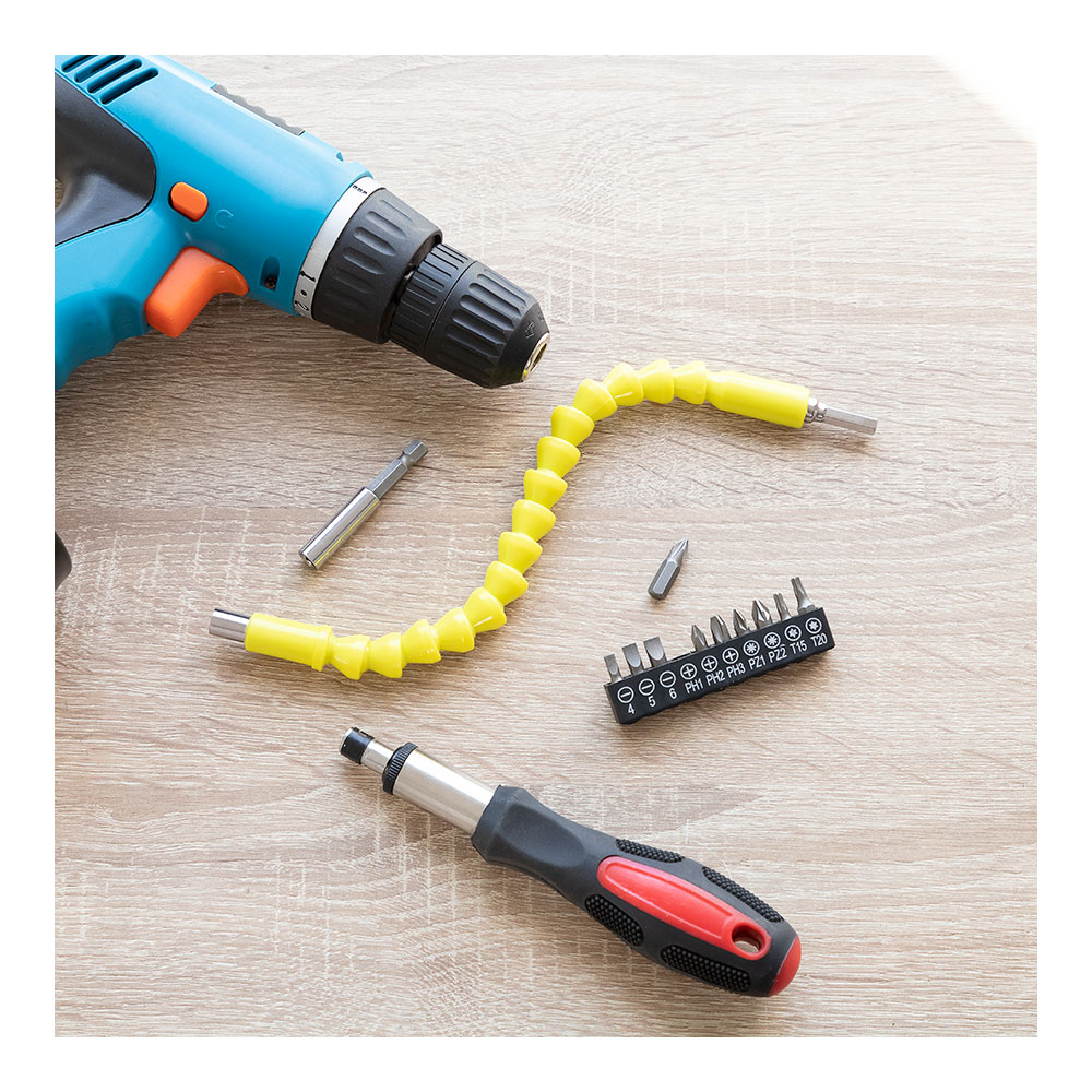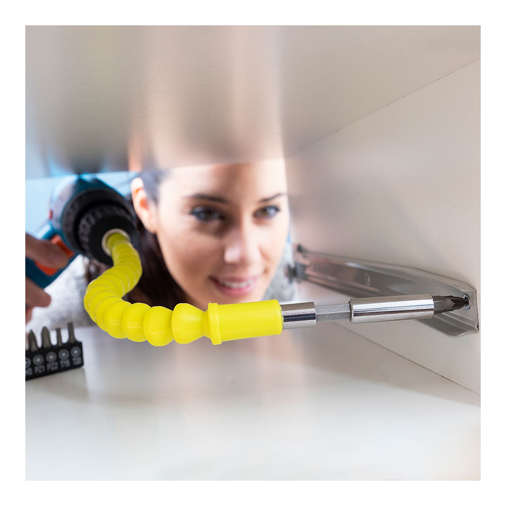 EXTENSOR FLEXIBLE MAGNÉTICO PARA ATORNILLADOR V0103407 INNOVAGOODS. EXTENSOR FLEXIBLE MAGNÉTICO PARA ATORNILLADOR CON ROTACIÓN 360° QUE PERMITE ATORNILLAR O DESATORNILLAR EN ZONAS DE DIFÍCIL ACCESO O EN ESPACIOS PEQUEÑOS Y LIMITADOS, FACILITANDO POSICIONES MÁS CÓMODAS A LA HORA DE TRABAJAR. SE PUEDE USAR CON HERRAMIENTAS ELÉCTRICAS O MANUALES (ATORNILLADOR, DESTORNILLADOR, TALADRO). ADEMÁS, INCLUYE VARIOS ACCESORIOS PARA QUE EL TRABAJO DE BRICOLAJE SEA MÁS SENCILLO Y COMPLETO. EL SOPORTE PARA PUNTAS ES PERFECTO PARA GUARDAR Y MANTENER ORDENADAS LAS 10 PUNTAS INCLUIDAS (3 PUNTAS PLANAS TIPO 4-5-6, 3 PUNTAS TIPO PH1-PH2-PH3, 2 PUNTAS TIPO PZ1-PZ2 Y 2 PUNTAS TIPO T15-T20). EL ADAPTADOR UNIVERSAL PARA PUNTAS TAMBIÉN ES MAGNÉTICO. MATERIAL:PE,ACERO, COLOR: AMARILLO. INCLUYE ACCESORIOS:10 PUNTAS, SOPORTE PARA PUNTAS ADAPTADOR PARA PUNTAS. MEDIDAS APROX.: Ø1,5×29,1cm (diámetro/largo)