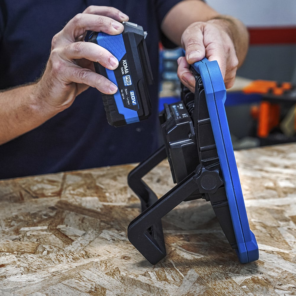 FOCO PROYECTOR LED COB. POTENCIA: 20W. BATERIA LI-ION 20V DC. (SIN BATERÍA NI CARGADOR). CUERPO DE ALUMINIO. INDICE DE REPRODUCCION CROMATICA (CRI) >80. TIPO DE LUZ FRIA 6500K – ANGULO DE APERTURA 120°. IP20. 2 INTENSIDADES DE LUZ : 900lm/1800lm. PIE REGULABLE. (DURACION HASTA 3.5h CON BATERIA 2.0A/7h CON BATERIA DE 4.0A) – DIMENSIONES: 22,8x7x22,8cm. KOMA TOOLS PRO SERIES BATTERIE