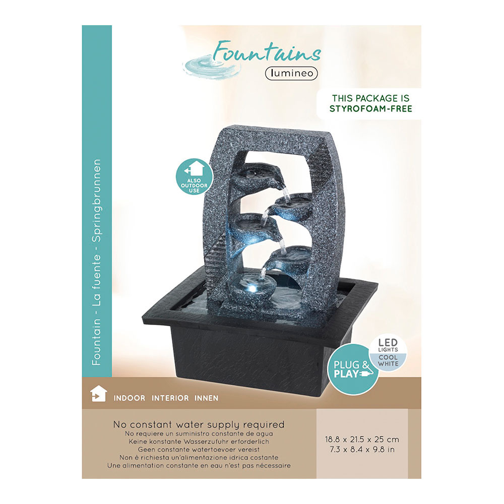 FUENTE DE POLIRESINA 892530 FUENTE DE POLIRESINA PARA INTERIOR Y EXTERIOR CON DISEÑOS SURTIDOS Y COLOR LED BLANCO FRIO CONECTOR LED A BOMBA DE PESO LIGERO. TAMAÑO 21,5×18,5x25cm COLORES / MODELOS SURTIDOS