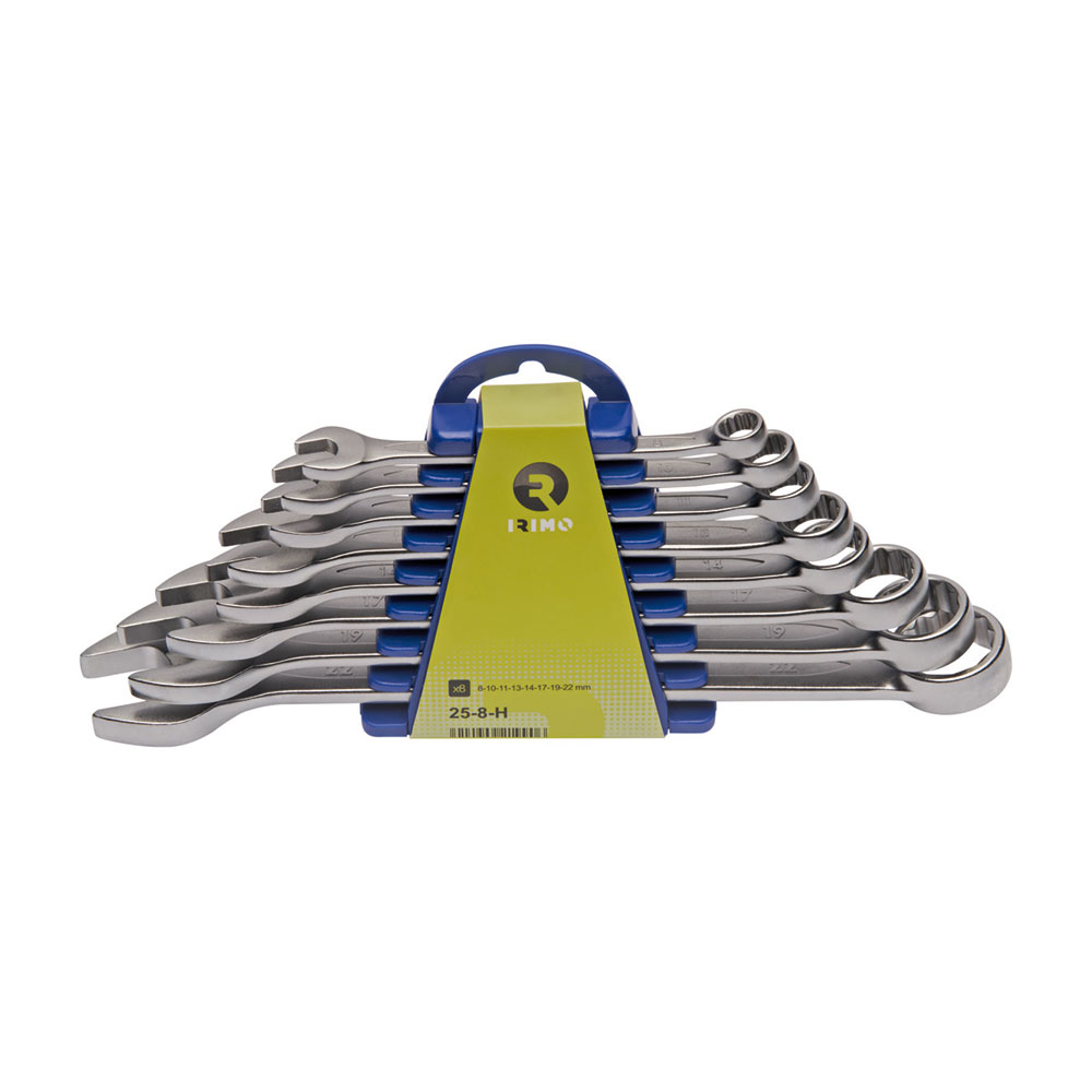 JUEGO 8 LLAVES COMBINADAS 8-22mm 25-8-H. JUEGO DE 8 PIEZAS CON SOPORTE DE PLÁSTICO. COMPONENTES: LLAVES COMBINADAS DE 8 A 22mm. ACABADO: CROMADO MATE. MATERIAL: ALEACIÓN DE ACERO DE ALTO RENDIMIENTO. DUREZA: 42-50 HRC. NORMAS: ISO 10102.