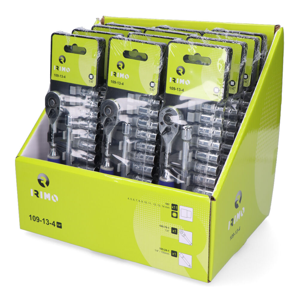 JUEGO DE CARRACA 1/4″, VASOS Y ALARGADOR, 13 PIEZAS 109-13-4. JUEGO DE VASOS DE 1/4″ EN EXPOSITOR. JUEGO DE 11 VASOS+CARRACA+ALARGADOR. VASOS HEXAGONALES EN DIMENSIONES MÉTRICAS. ACABADO CROMADO BRILLANTE. EL EXPOSITOR INCLUYE 12 JUEGOS. DIN 3120, DIN 3124 Y DIN 3122.”