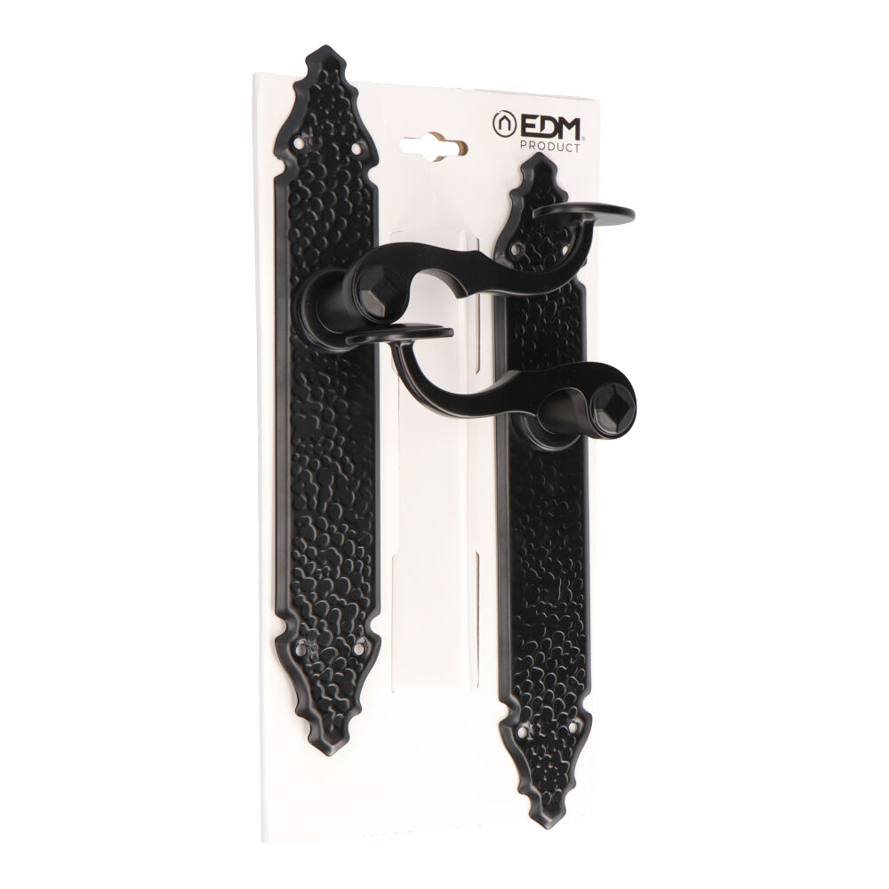 JUEGO DE MANILLAS ESTILO RÚSTICO 272. MEDIDA DE LA PLACA 275 x 45 mm. MATERIAL PLACA DE ACERO Y MANETA DE ALUMINIO. ACABADO NEGRO (TORNILLOS INCLUIDOS)