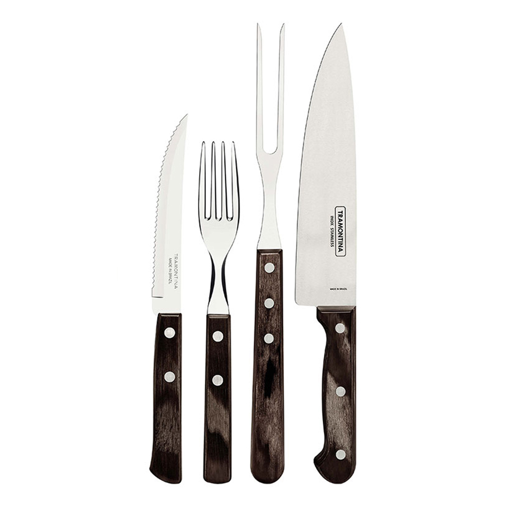 JUEGO PARA ASADO 14 PIEZAS FSC POLYWOOD CASTAÑO TRAMONTINA. JUEGO DE CUBIERTOS PARA ASADO TRAMONTINA, DE ACERO INOXIDABLE CON MANGOS CASTAÑOS, DE MADERA, POLYWOOD, 12 PIEZAS. LÁMINAS DE ACERO INOXIDABLE ALTAMENTE DURABLES. LOS MANGOS DE MADERA TRATADA SON RESISTENTES A IMPACTOS Y ALTAS TEMPERATURAS ANTES DEL PRIMER USO, LAVE BIEN LAS PIEZAS Y SÉQUELAS. PARA MAYOR DURABILIDAD DE LOS CUBIERTOS, SE RECOMIENDA SECARLOS BIEN ANTES DE GUARDARLOS, INCLUSO DESPUÉS DE HABER SIDO LAVADOS EN LAVAVAJILLAS. INCLUYE: 6 TENEDORES DE MESA, 6 CUCHILLOS DE ASADO 5″, 1 TENEDOR TRINCHANTE Y 1 CUCHILLO DE COCINA
