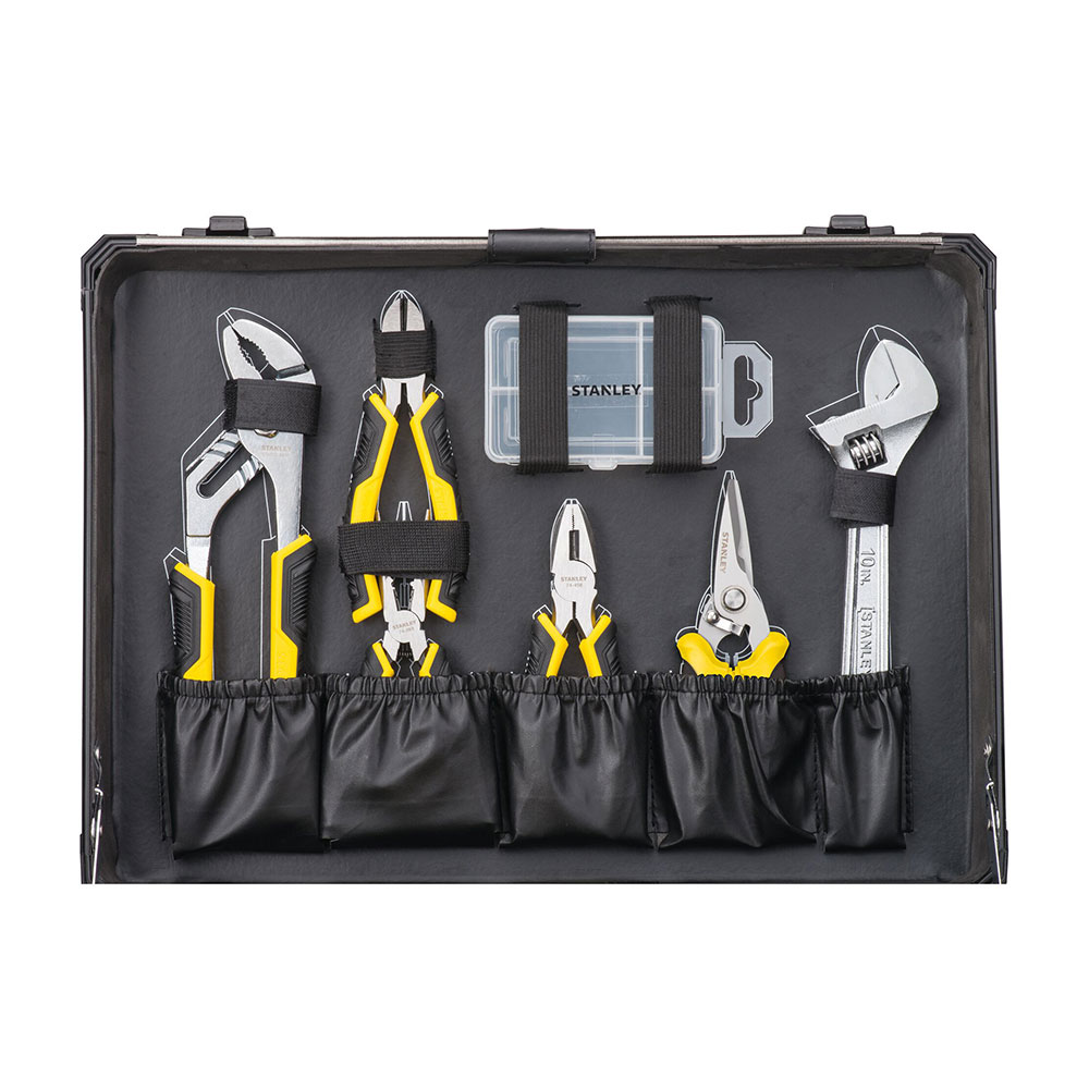 KIT DE MANTENIMIENTO CON MALETÍN DE ALUMINIO 142 PIEZAS STMT98109-1 STANLEY. MALETÍN DE ALUMINIO. MATERIAL LIGERO PARA FACILITAR EL TRANSPORTE, MÁXIMA DURABILIDAD PARA TODOS LO TIPOS DE ENTORNO. INTERIOR INTELIGENTE. TRES PANELES INTERIORES EQUIPADOS CON ELÁSTICOS PARA SUJETAR LAS HERRAMIENTAS, SISTEMA DE BLOQUEO DEL PANEL PLEGLABLE Y BASE CON ESPUMA BICOLOR RECORTADA. CIERRES METÁLICOS Y ASA DE TRANSPORTE DE ALTA DURABILIDAD.