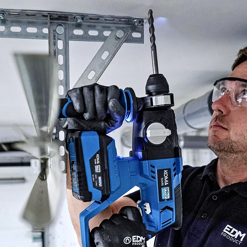 KIT MALETIN MARTILLO PERFORADOR 20 V CON 1 BATERIA LI-ION 4.0A. Y CARGADOR 08772. VELOCIDAD VARIABLE DE 0-1.700rpm. FRECUENCIA DE IMPACTO: 0 A 5500t/min. FUERZA DE IMPACTO: 1,8J. 3 FUNCIONES (PERCUTOR + TALADRO + TALADRO/PERCUTOR). PORTABROCAS SDS+. CAPACIDAD DE PERFORACION MADERA 26mm, ACERO 13mm, HORMIGON 20mm. MANGO ADICIONAL CON VARILLA DE CONTROL DE PROFUNDIDAD. LUZ LED PARA ILUMINAR EL PUNTO DE TRABAJO. INCLUYE 3 BROCAS SDS DE 8, 10 Y 12mm .DIMENSIONES: 30×19.5cm