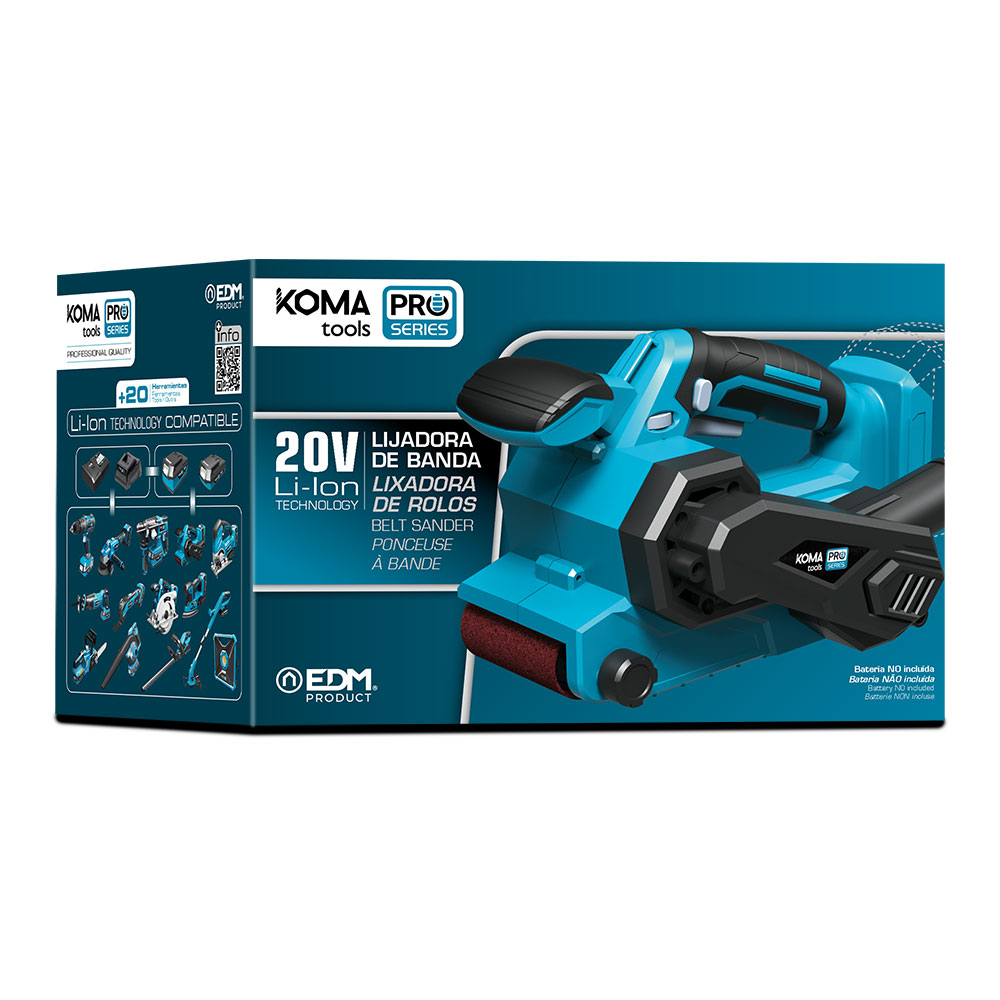 LIJADORA DE BANDA. POTENCIA: 20 V LI-ION (SIN BATERÍA NI CARGADOR) POMO DE AGARRE DELANTERO. VELOCIDAD 120-350m/min. SALIDA PARA ASPIRADOR. REGULADOR DE CENTRADO. LIJA DE 76x 457mm. 14×27,5x17cm