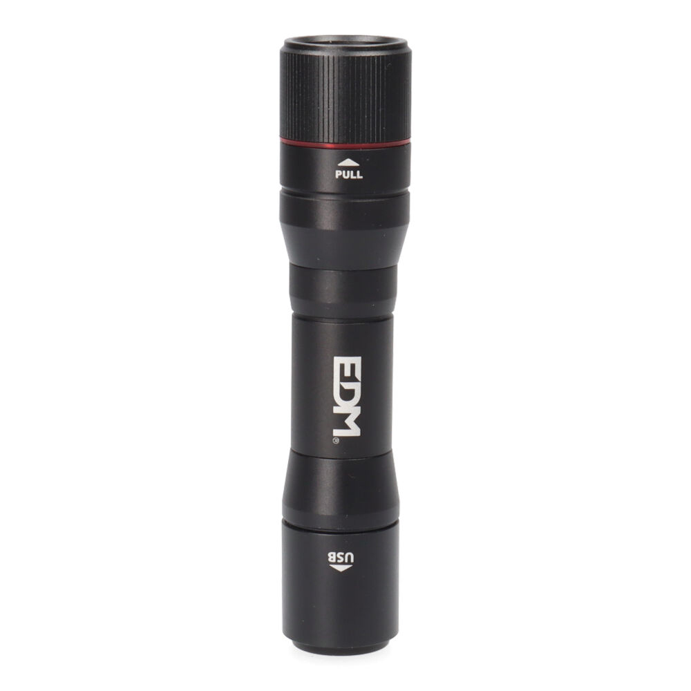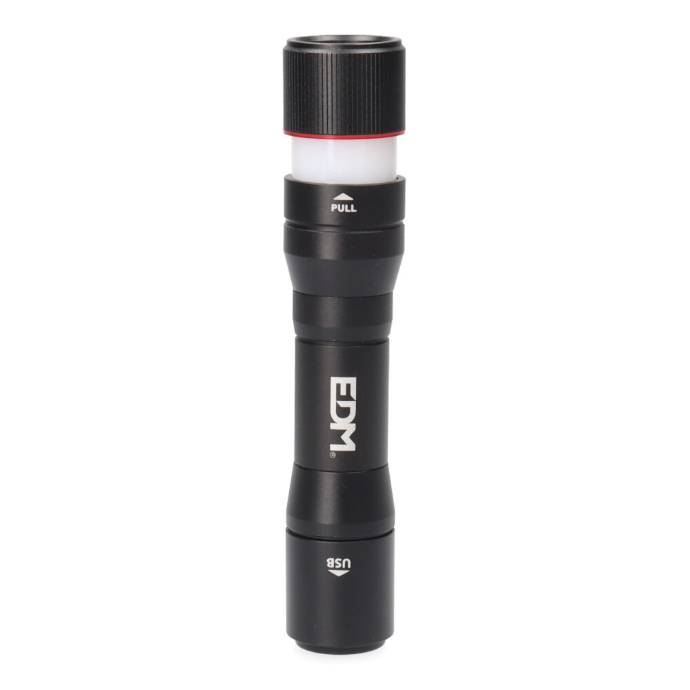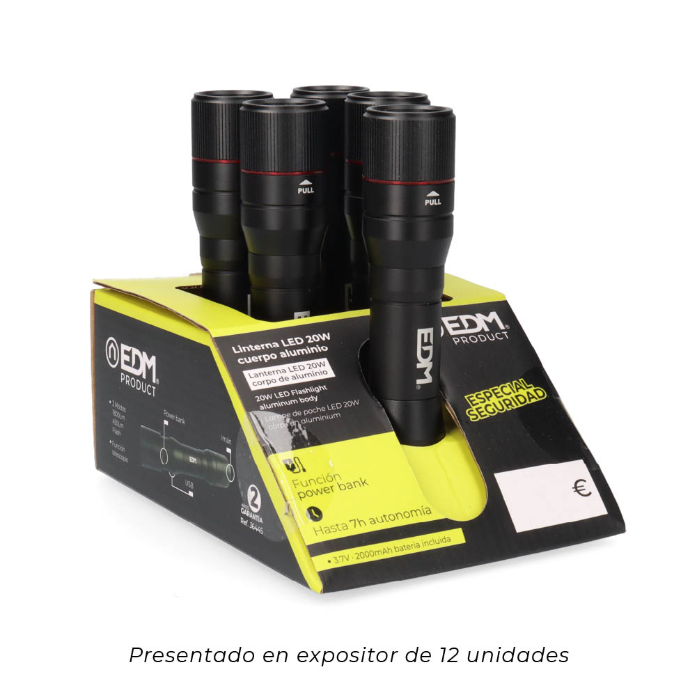 LINTERNA DE 1 LED RECARGABLE 20W 8500K. CUERPO DE ALUMINIO. CON FUNCION POWER BANK, HASTA 7h DE AUTONOMIA, CON BATERIA RECARBABLE 3,7V 2000mAh.CARGA DE 4,5 HORAS. 3 MODOS ILUMINACION: 1800lm, 450lm Y FUNCION FLASH. FUNCION TELESCOPIO, BASE MAGNETICA, IP44, RESISTENCIA A SALPICADURAS.TAMAÑO: Ø3×14,4cm. INCLUYE CABLE DE CARGA TIPO C. PRESENTACIÓN EN EXPOSITOR DE 12 UNIDADES