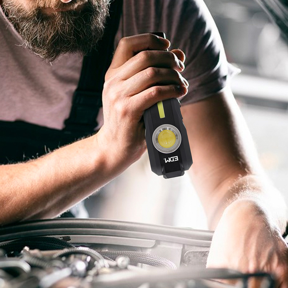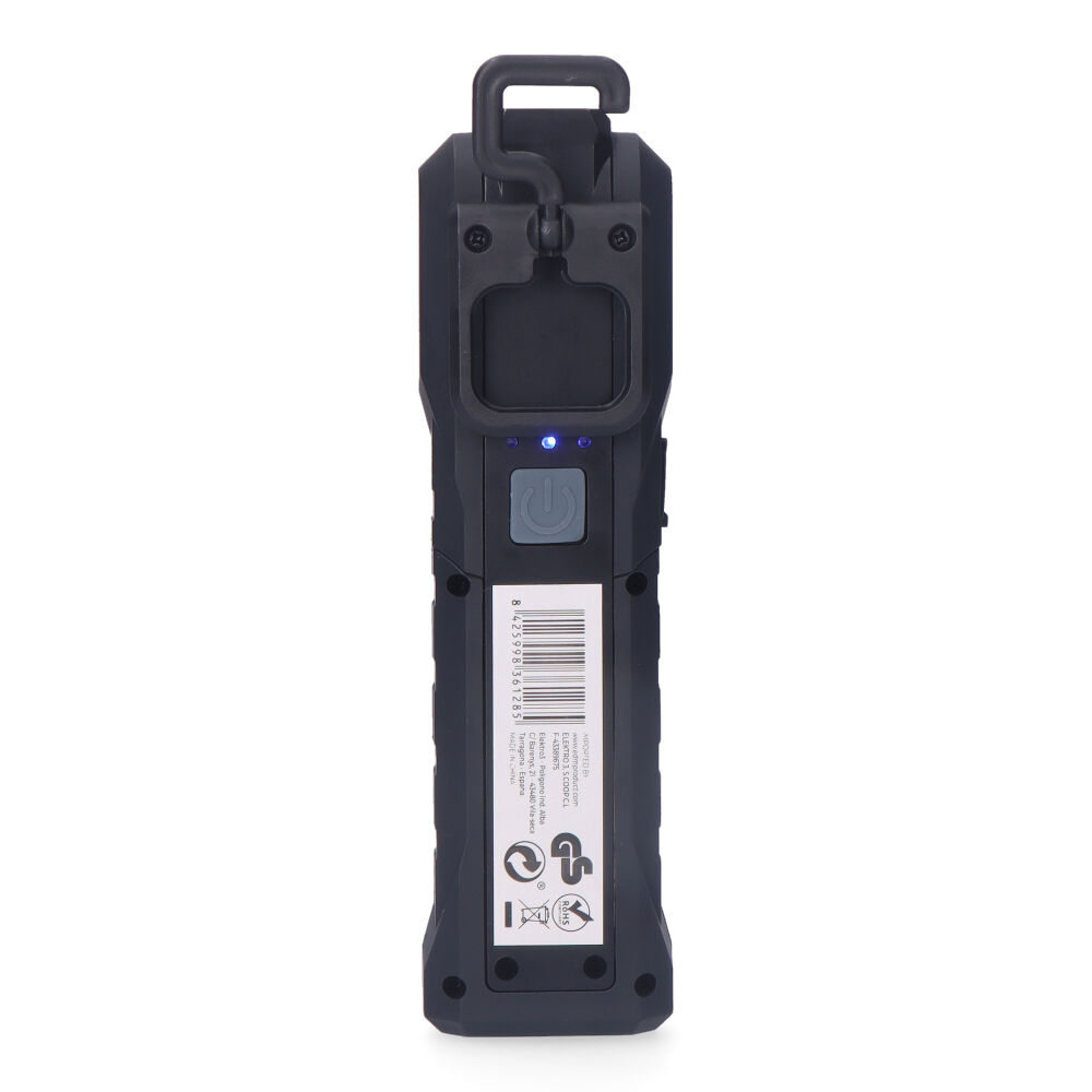 LINTERNA DE TRABAJO LED, COB REDONDA 200lm 5W 4.200K + COB FRONTAL 200lm 5W 6.500K + SPOT SUPERIOR 50lm 3W 6.500K. MATERIAL: ABS + ALUMINIO. BATERIA 1500mAh DE LITIO INCLUIDA RECARGABLE.CARGA USB TIPO C , CABLE INCLUIDO. CARGA DE 3,5HORAS. INDICADOR DE BATERIA. HASTA 8 HORAS DE AUTONOMÍA. INCLUYE BASE BASCULANTE 180º, GANCHO PARA COLGAR Y BASE IMANTADA. MEDIDAS:40 x 42 x 154 mm. PRESENTADO EN EXPOSITOR DE 6 UNIDADES
