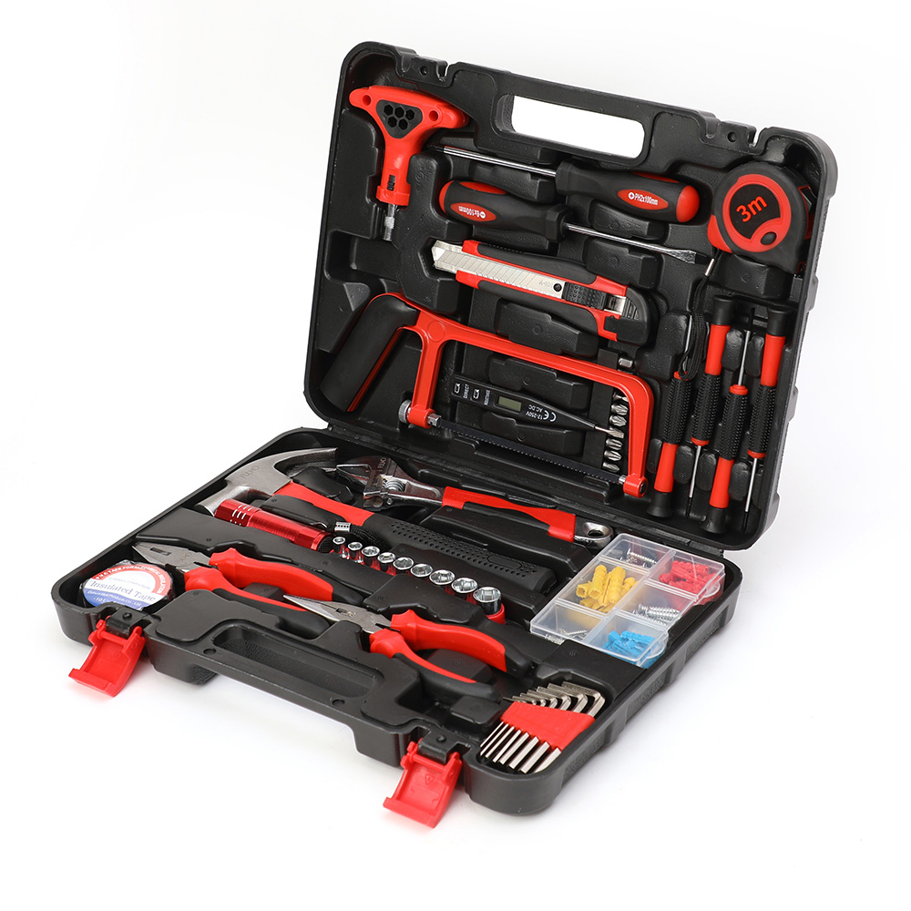 CONJUNTO DE HERRAMIENTAS DE 46 PIEZAS QUE INCLUYE: UN DESTORNILLADOR SL5 8 x 100 mm; UN DESTORNILLADOR PH5 8 x 100 mm; CUATRO DESTORNILLADORES DE PRECISIÓN (+2,5 -2,5 +3,0 -3.0); UN CÚTER, UN BUSCAPOLOS; UN ROLLO DE CINTA AISLANTE; UN MANGO DE CARRACA; NUEVE LLAVES ALLEN DE 1/4 (5 6 7 8 9 10 11 12 13), NUEVE PUNTAS DE 25 mm; UN PORTAPUNTAS; OCHO VASOS HEXAGONALES (1,5 2 2,5 3 4 5 5,5 6); UNA SIERRA PEQUEÑA; UNA CINTA MÉTRICA 3 M; UN ALICATE DE PUNTA DE 6″; UN ALICATE COMBINADO DE 6″; UNA LLAVE INGLESA DE 8″; UN MARTILLO; UNA LINTERNA; UNA CAJA TACOS Y TORNILLOS DE 60 UNIDADES; UN MALETÍN
