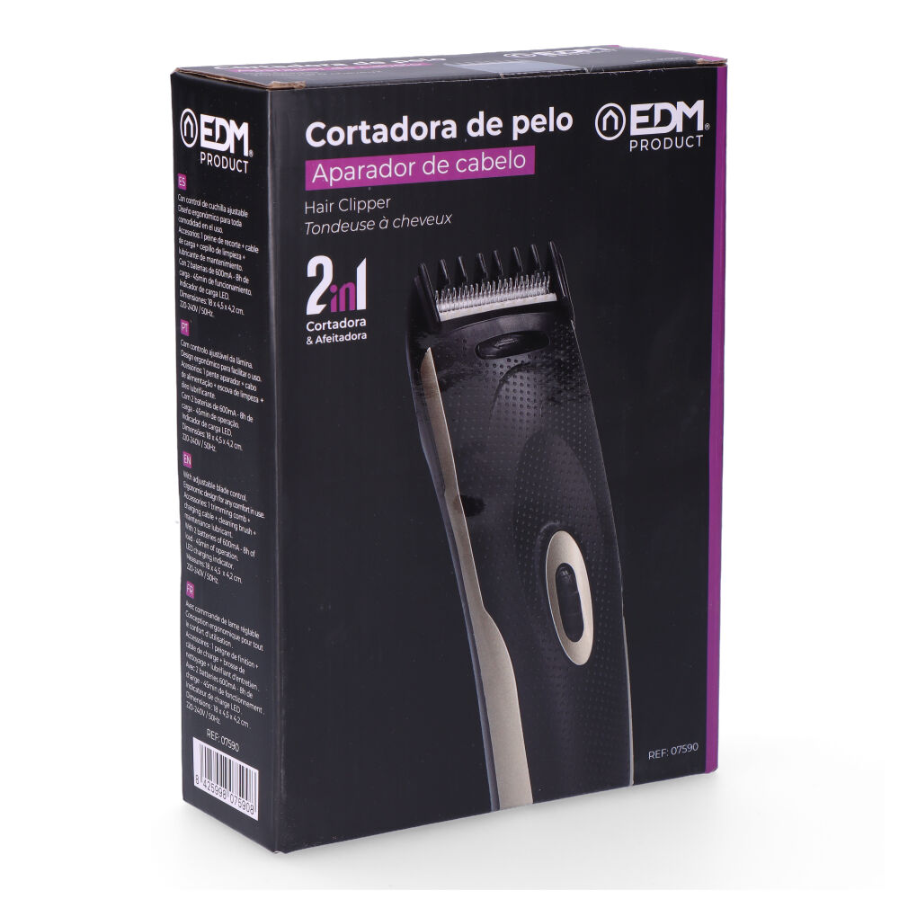MAQUINA CORTA CABELLOS RECARGABLE INALAMBRICA 10W. CONTROL DE CUCHILLA AJUSTABLE. DISEÑO ERGONOMICO. ACCESORIOS: 1 PEINE DE RECORTE + CABLE DE CARGA + CEPILLO DE LIMPIEZA + LUBRICANTE DE MANTENIMIENTO – CON 2 BATERIAS DE 600mA – 8h DE CARGA – 45min DE FUNCIONAMIENTO. INDICADOR DE CARGA LED. DIMENSIONES: 4,5×3,5x18cm (ancho/fondo/alto) – 220/240 50Hz EDM