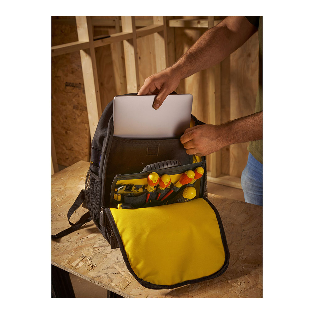 MOCHILA PARA FACILITAR EL TRANSPORTE Y EL ALMACENAMIENTO DE HERRAMIENTAS. DEJA LAS MANOS LIBRES. 600×600 TELA DENIER PARA GARANTIZAR SU DURABILIDAD. DIVISOR DESMONTABLE CON BOLSILLOS PARA LAS HERRAMIENTAS DE USO FRECUENTE. ESPALDAS ACOLCHADAS, MÁS ERGONOMIA E TRANSPORTE CONVENIENTE. COMPARTIMENTO INDEPENDIDENTE PARA PORTÁTILES/HERRAMIENTA ELÉCTRICA, MANTIENE LAS HERRAMIENTAS ELÉCTRICAS Y PORTÁTILES SEGUROS. COMPARTIMIENTO DELANTERO PEQUEÑO DE ALMACENAMIENTO PERSONAL. CAPACIDAD DE CARGA DE 15kg. STANLEY