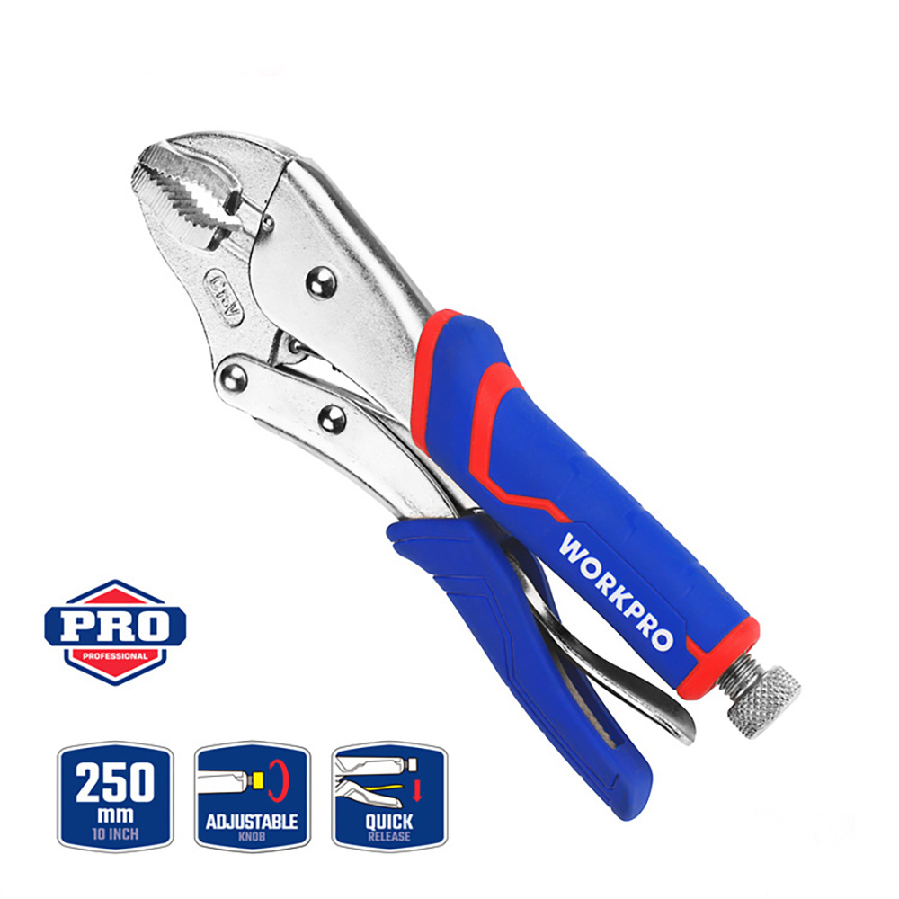 MORDAZAS DE PRESIÓN 250mm (10″) . ACERO CROMO MOLIBDENO PARA MÁXIMA DURABILIDAD. ACCIÓN DE BLOQUEO Y LIBERACIÓN RÁPIDA Y SENCILLA. LA LIBERACIÓN PROTEGIDA AYUDA A MANTENER EL TRABAJO RÁPIDO Y SEGURO. GIRE EL TORNILLO PARA AJUSTAR LA PRESIÓN DE SUJECIÓN. MANGO DE AGARRE CÓMODO DE TRES MATERIALES