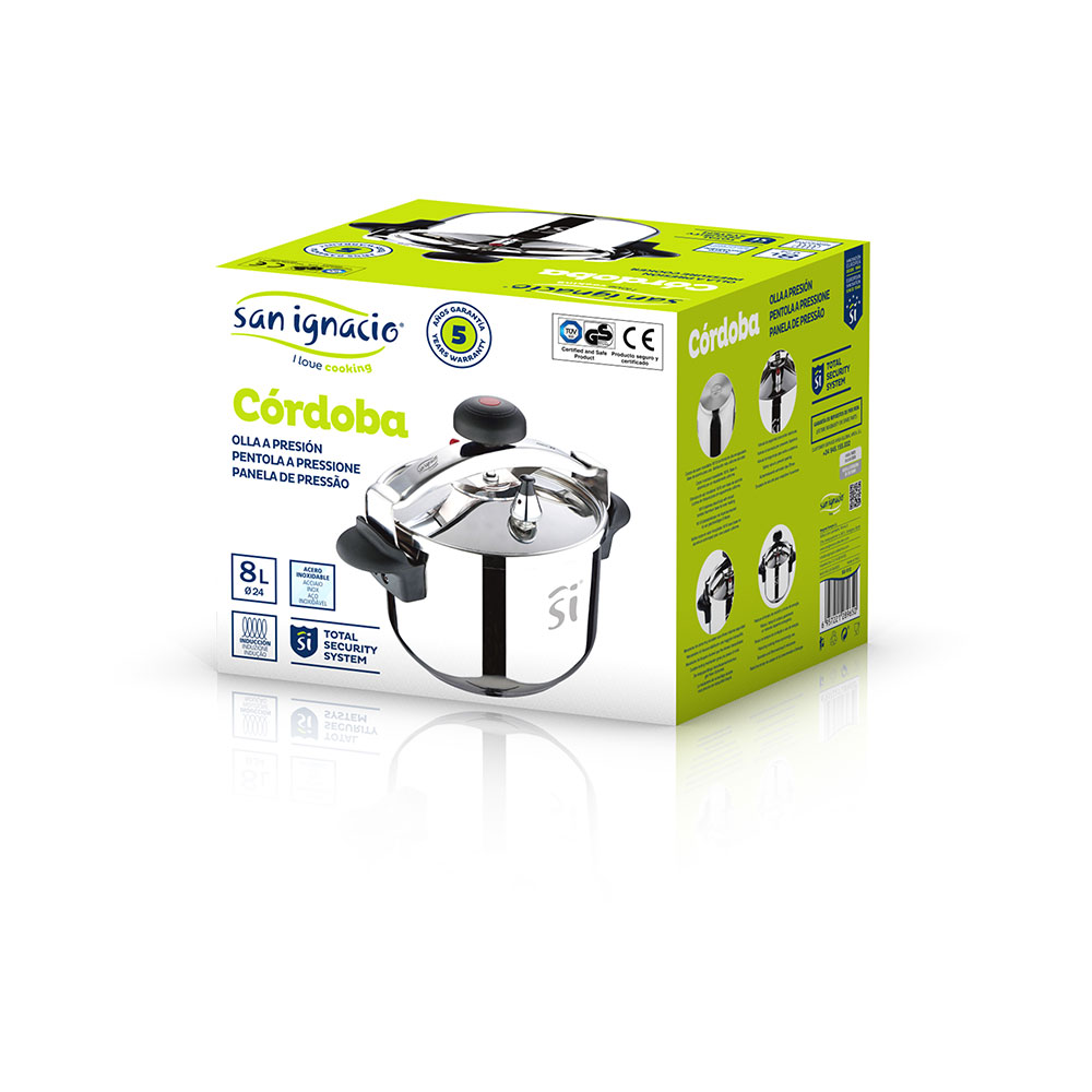 OLLA A PRESIÓN Ø24cm 8L ACERO INOXIDABLE 1mm DE GROSOR CORDOBA SG1512 SAN IGNACIO. OLLA COMPATIBLE CON INDUCCIÓN. LA OLLA ES APTA PARA LAS COCINAS DE INDUCCIÓN Y TRADICIONALES, ESTO AMPLIA EL USO A LOS USUARIOS AL MISMO TIEMPO QUE COCE EFICIENTEMENTE LOS ALIMENTOS. MECANISMO DE PRESIÓN. LA OLLA RÁPIDA SE CARACTERIZA POR LA EFICIENCIA AL COCINAR, ESTO GRACIAS A LA DISTRIBUCIÓN PROPORCIONAL DEL CALOR EN EL INTERIOR DE LAS PAREDES DE LA MISMA. GRAN CAPACIDAD DE ALMACENAMIENTO. EL TAMAÑO DE ESTA CACEROLA DE 8 LITROS PERMITE UN ALMACENAMIENTO MAYOR DE LOS ALIMENTOS, LO CUAL FAVORECE UNA PREPARACIÓN MÁS RÁPIDA E IGUAL DE EFICIENTE. FABRICADA EN ACERO INOXIDABLE. SU MATERIAL DE FABRICACIÓN SE ENCARGA DE MANTENER EL ESTADO ÓPTIMO DE LA COMIDA. DE IGUAL FORMA, IMPIDE EL DESGASTE DE LA PIEZA POR EL CALOR. MANGO ERGONÓMICO. EL DISEÑO DEL ASA CON EFECTO FRÍO PERMITE UN MEJOR AGARRE DE LA PIEZA, ESTO AYUDA A EVITAR LAS CAÍDAS O QUEMADURAS CAUSADAS POR LA EXPOSICIÓN PROLONGADA AL CALOR.