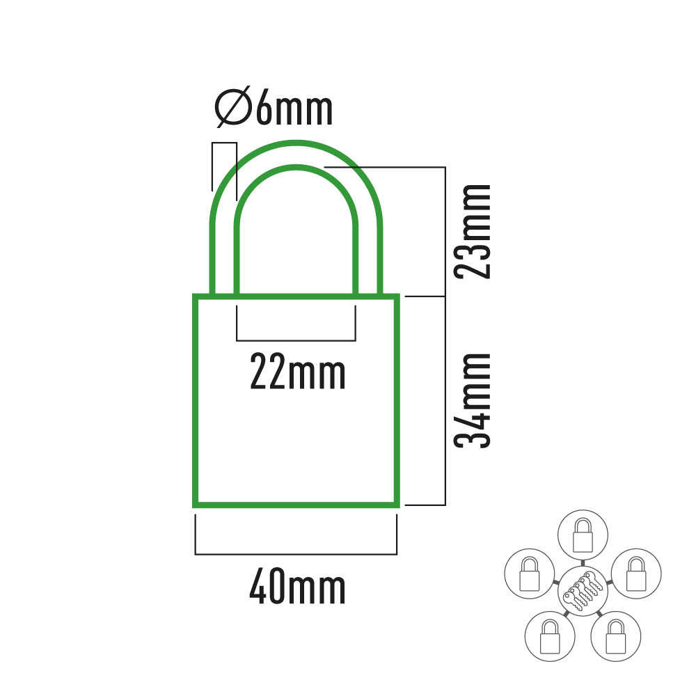 PACK 5 CANDADOS DE LATÓN CON ARCO NORMAL CON 5 LLAVES IGUALES, MISMA LLAVE PARA LOS 5 CANDADOS. DIMENSIONES CANDADO: 40 x 10 x 35 mm, DIMENSIONES ARCO 23 x 25 mm Ø6 mm, ALTURA TOTAL CANDADO 65 mm