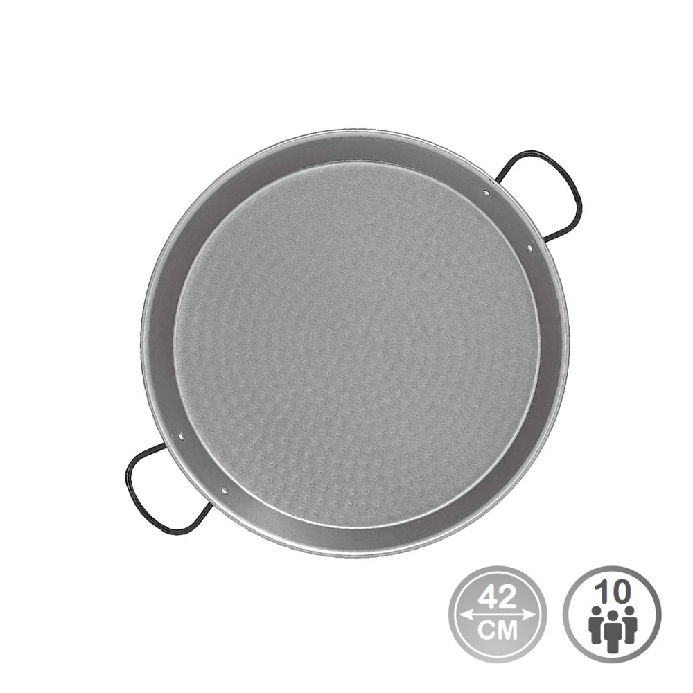 PAELLERA TRADICIONAL DE ACERO PULIDO Ø42cm (10 PERSONAS) APTA PARA COCINAS DE GAS. FABRICACION NACIONAL. ATENCIÓN: REQUIERE MANTENIMIENTO. DEBE SER ALMACENADO CON UNA CUBIERTA DE ACEITE. VAELLO