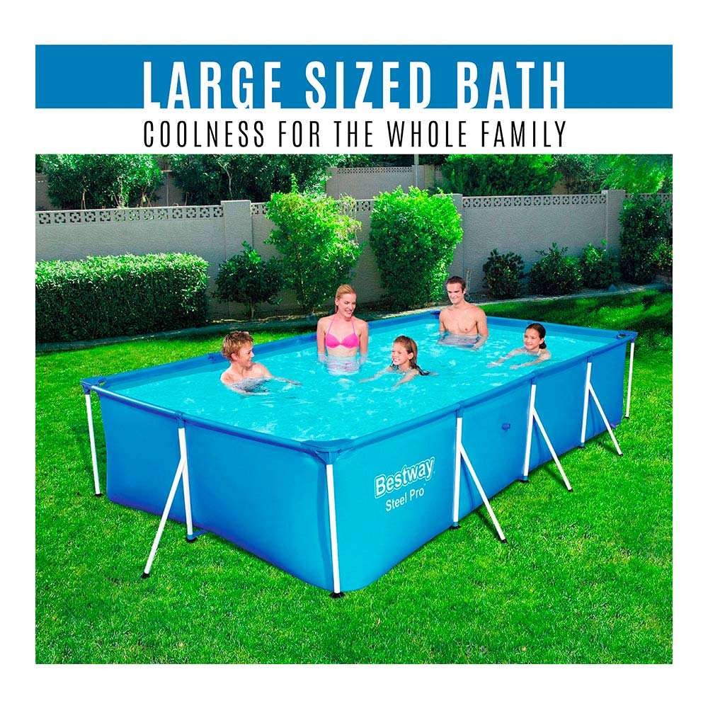 PISCINA POOL FRAME DIMENSIONES: 400x211x81cm (ancho/fondo/alto) PVC BESTWAY 56405CB. 5700 l. FÁCIL MONTAJE. PARA REFRESCARSE EN EL JARDÍN, LA PISCINA PORTÁTIL SE INSTALA FÁCIL Y RÁPIDAMENTE. MUY ESTABLE. LA PISCINA RECTANGULAR CON RESISTENTE MARCO DE ACERO NO REQUIERE HERRAMIENTAS PARA SU MONTAJE. VACIADO SENCILLO. LA VÁLVULA DE DRENAJE INTEGRADA PERMITE VACIAR SIN COMPLICACIONES LA PISCINA DESMONTABLE. PROTECCIÓN. PARA PROLONGAR SU DURACIÓN, LA PISCINA TUBULAR CUENTA CON UN REVESTIMIENTO ANTICORROSIÓN. INCLUYE. PISCINA DESMONTABLE RECTANGULAR PARA NIÑOS STEEL PRO DE BESTWAY Y PARCHE DE REPARACIÓN AUTOADHESIVO, MATERIAL: TRITECH, AZUL. (DEPURADORA Y FILTRO NO INCLUIDOS)