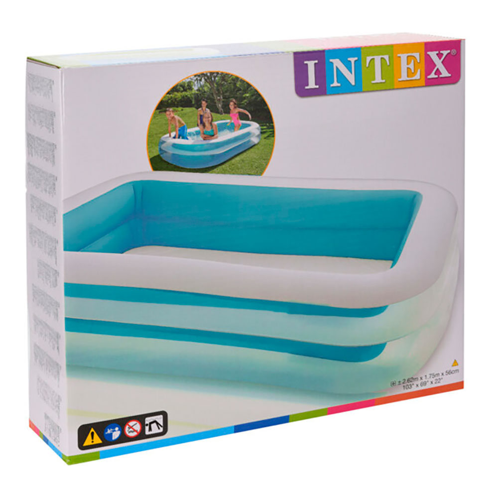 PISCINA RECTANGULAR 2 AROS. MEDIDAS: 262x175x56cm (ancho/fondo/alto) 2 CÁMARAS DE AIRE. INCLUYE PARCHE DE REPARACION. (NO INCLUYE DEPURADORA). MATERIAL: PVC. INTEX