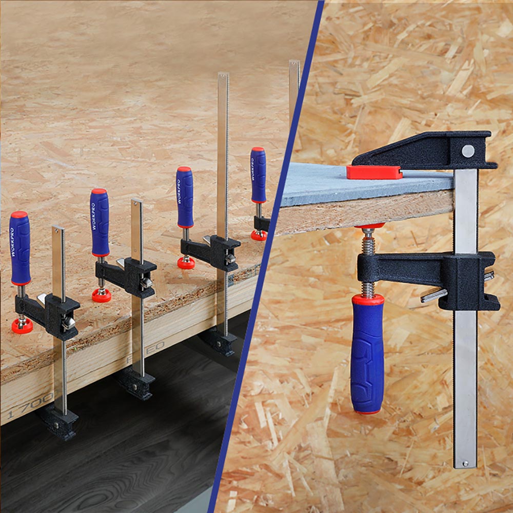 SARGENTO DE BARRA DE ACERO DE 300mm (12). LIBERACIÓN RÁPIDA. MANGO DE MADERA DE FORMA ERGONOMICA. 2 ALMOHADILLAS DE SUJECIÓN PROTEGEN LAS PIEZAS DE TRABAJO CONTRA DAÑOS. LOS TORNILLOS DE ACERO ESTIRADOS EN FRÍO MEJORAN LA CAPACIDAD DE AGARRE. EL CABEZAL FIJO PRENSADO Y REMACHADO AÑADE PODER DE SUJECIÓN. WORKPRO