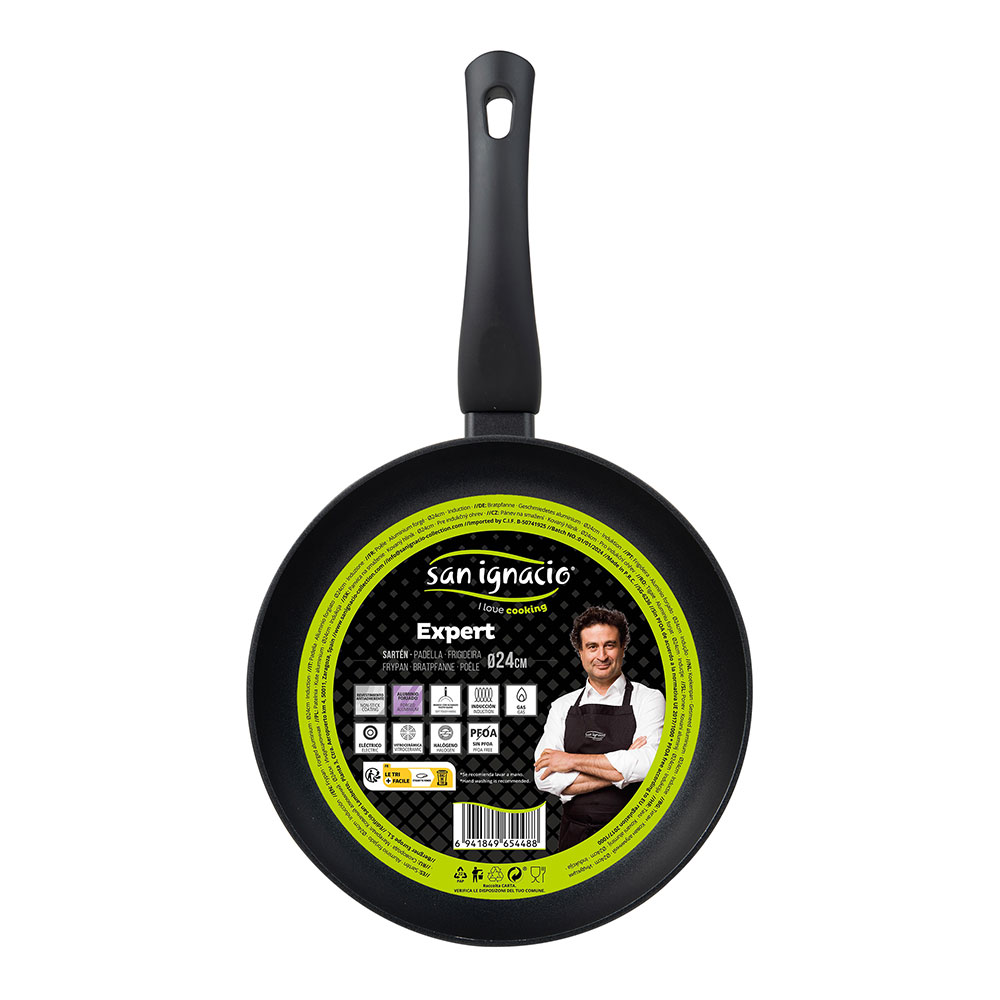 SARTÉN ALUMINIO FORJADO. INTERIOR CON REVESTIMIENTO ANTIADHERENTE DE DOS CAPAS EN NEGRO. EXTERIOR EN NEGRO. Ø24 cm. INDUCCIÓN. MANGO DE BAQUELITA EN NEGRO CON TACTO SUAVE. PROTECTOR DE LLAMA CON PINTURA