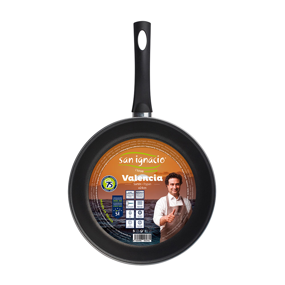 SARTEN Ø24×4.5cm ACERO CARBONO VALENCIA BGEU2519 SAN IGNACIO. REVESTIMIENTO ANTIADHERENTE SIN PFOA Y PTFE. COMPATIBLE CON TODOS LOS FUEGOS DEL MERCADO. MANGOS ERGONÓMICOS CON EFECTO “TACTO SUAVE”.