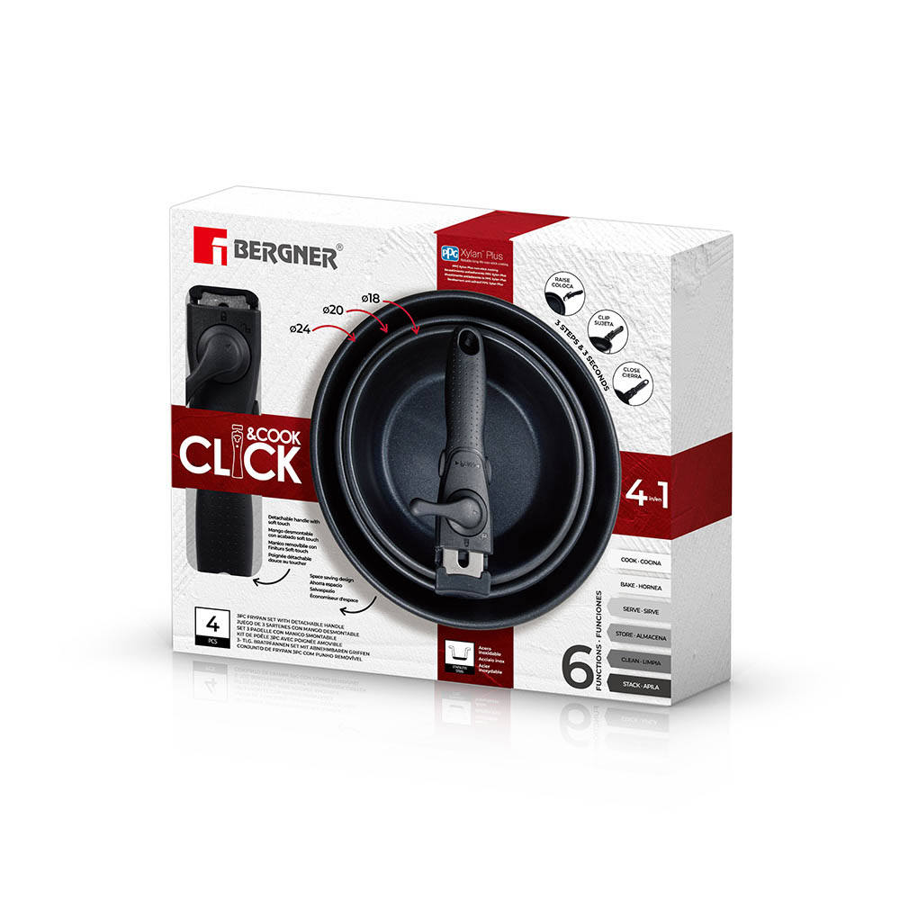 SET 3 SARTENES ACERO INOXIDABLE CLICK & COOK BERGNER. JUEGO DE 3 SARTENES DE ACERO INOXIDABLE. 1 SARTÉN Ø18x6cm, 1 SARTÉN Ø20×6.0cm, 1 SARTÉN Ø24×6.5cm CON 1 MANGO DESMONTABLE DE BAQUELITA. APTAS PARA LA INDUCCIÓN