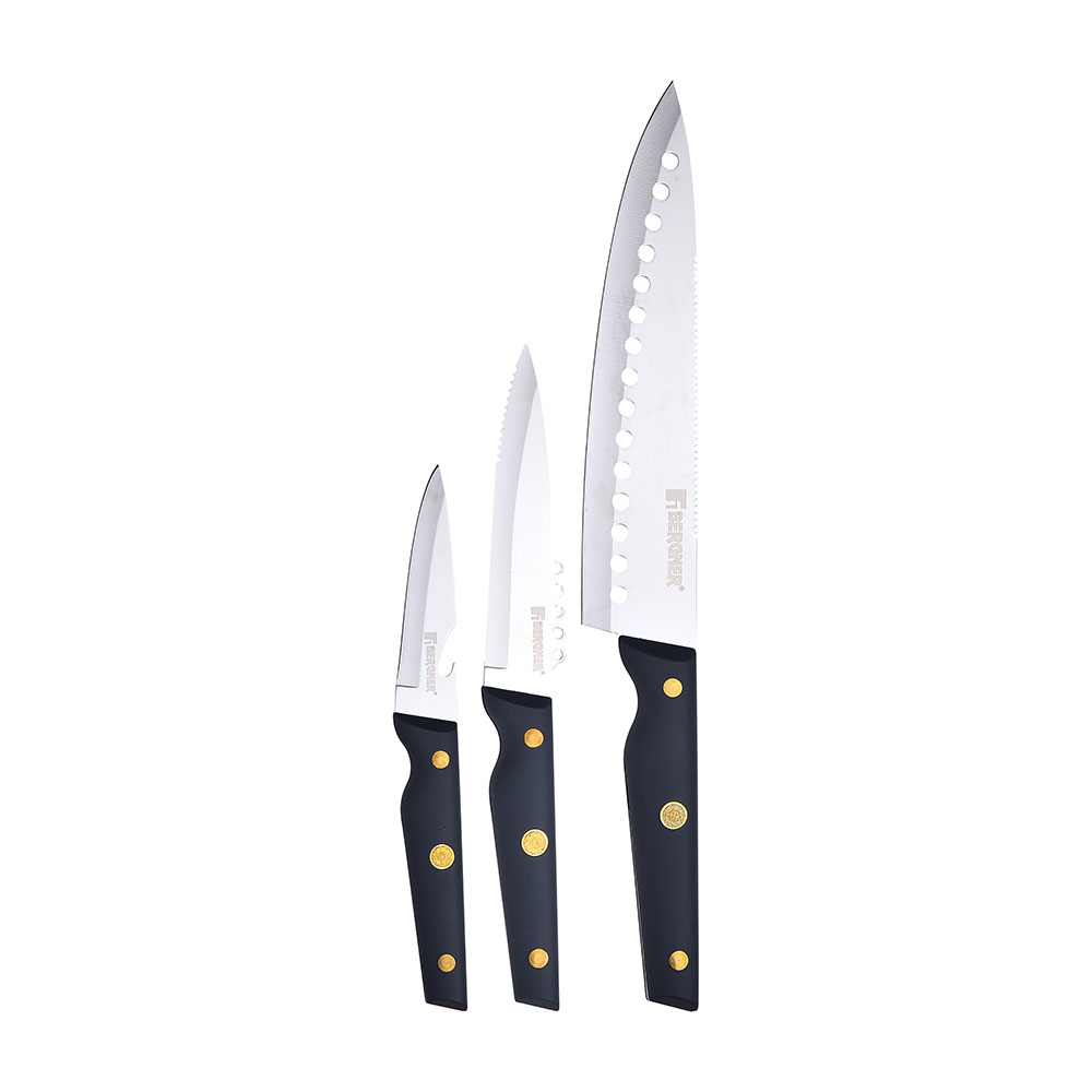 SET 3 unid. CUCHILLOS ACERO INOX. PRO REECO BG41026DBL BERGNER. SET DE 3 unid. CUCHILLOS ACERO INOXIDABLE 1 unid. CUCHILLO COCINERO 20cm 1 unid. CUCHILLO UTILITARIO 12,5cm 1 unid. CUCHILLO PARA VERDURAS 10cm CON MANGO DE ABS PULIDO BRILLANTE CON TACTO SUAVE AZUL OSCURO Y 3 REMACHES DE ACERO EN COLOR ACERO INOXIDABLE