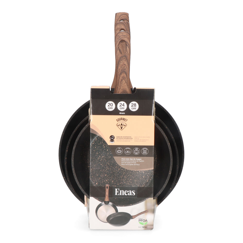 SET DE 3 SARTENES ANTIADHERENTES “SERIE ENEAS” GOURMET KITCHEN: INCLUYE SARTEN DE Ø20×4,5cm, Ø24×4,7cm, Ø28×5,5cm. APTA PARA INDUCCIÓN, VITROCERÁMICA, GAS Y PLACA ELÉCTRICA.