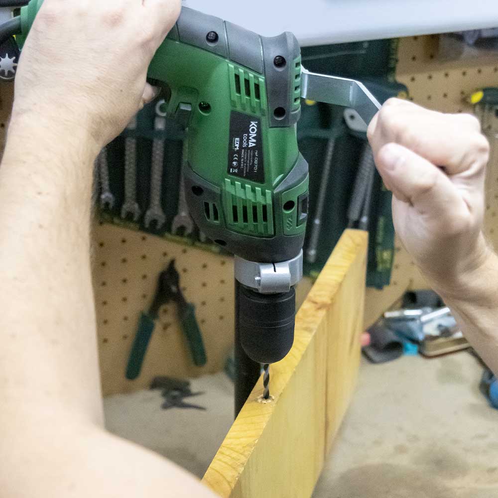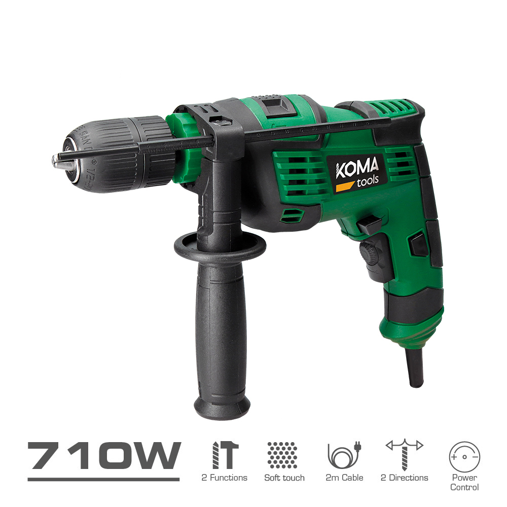 TALADRO PERCUTOR ELECTRICO. POTENCIA: 710W. VELOCIDAD VARIABLE DE 0 A 2600rpm. CON CONTROL DE POTENCIA. PORTABROCAS AUTOMATICO DE Ø13mm. MANGO ERGONOMICO DE TACTO SUAVE. MANGO ADICIONAL CON VARILLA DE PROFUNDIDAD. 2m DE CABLE. DIMENSIONES: 29x20cm 230-240V 50Hz KOMA TOOLS